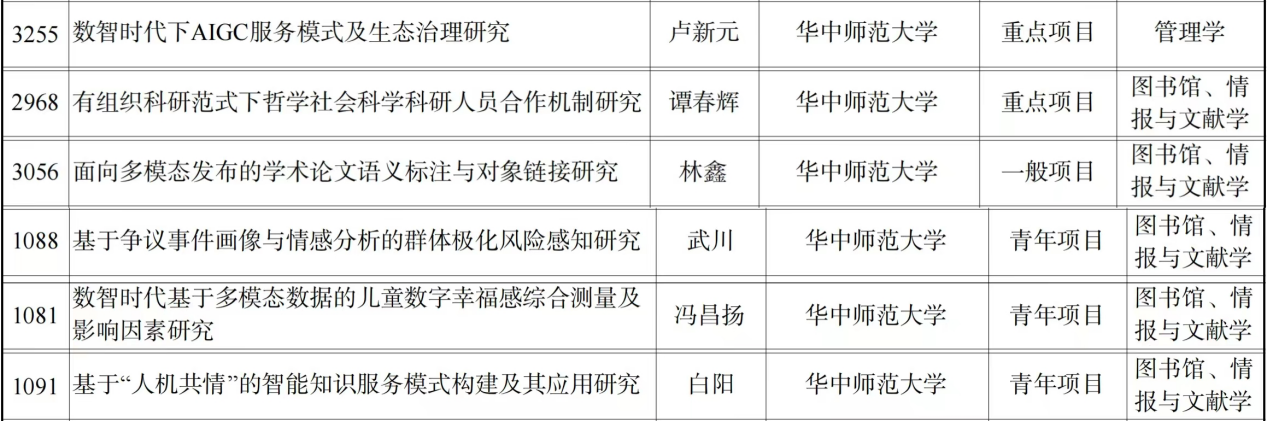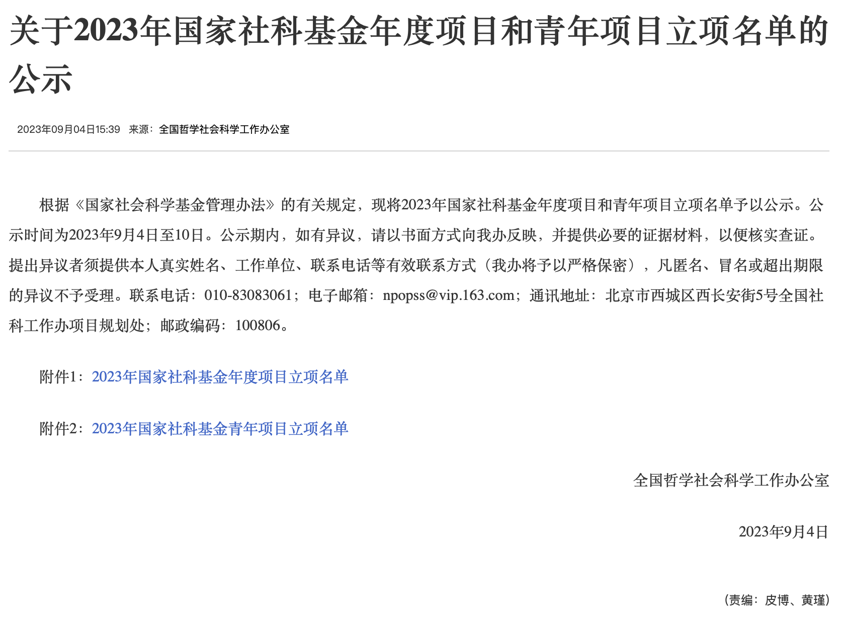 (通讯员 李琳)9月4日,全国哲学社会科学工作办公室公布了国家社科基金年度项目和青年项目立项公示名单。我院有6名教师获批国家社科基金项目。其中,卢新元教授、谭春辉教授获批社科重点项目。谨在此向我院6名老师表示祝贺!此前,在国家自然科学基金委员会公布的2023年国家自然科学基金集中接收申请项目评审结果中,我院获批两项青年科学基金项目。目前,我院在研的国家社科、自科项目有30余项。信息管理学院历来高度重视科研工作,通过创新机制、聚合团队、凝练方向、交叉融合、产学研结合、以老带新等方式,有效打造科研队伍“蓄水池”,不断提高学院科研工作能力和水平,以高水平的科研成果有力支撑高水平的人才培养体系,有效服务国家和行业战略需求。
