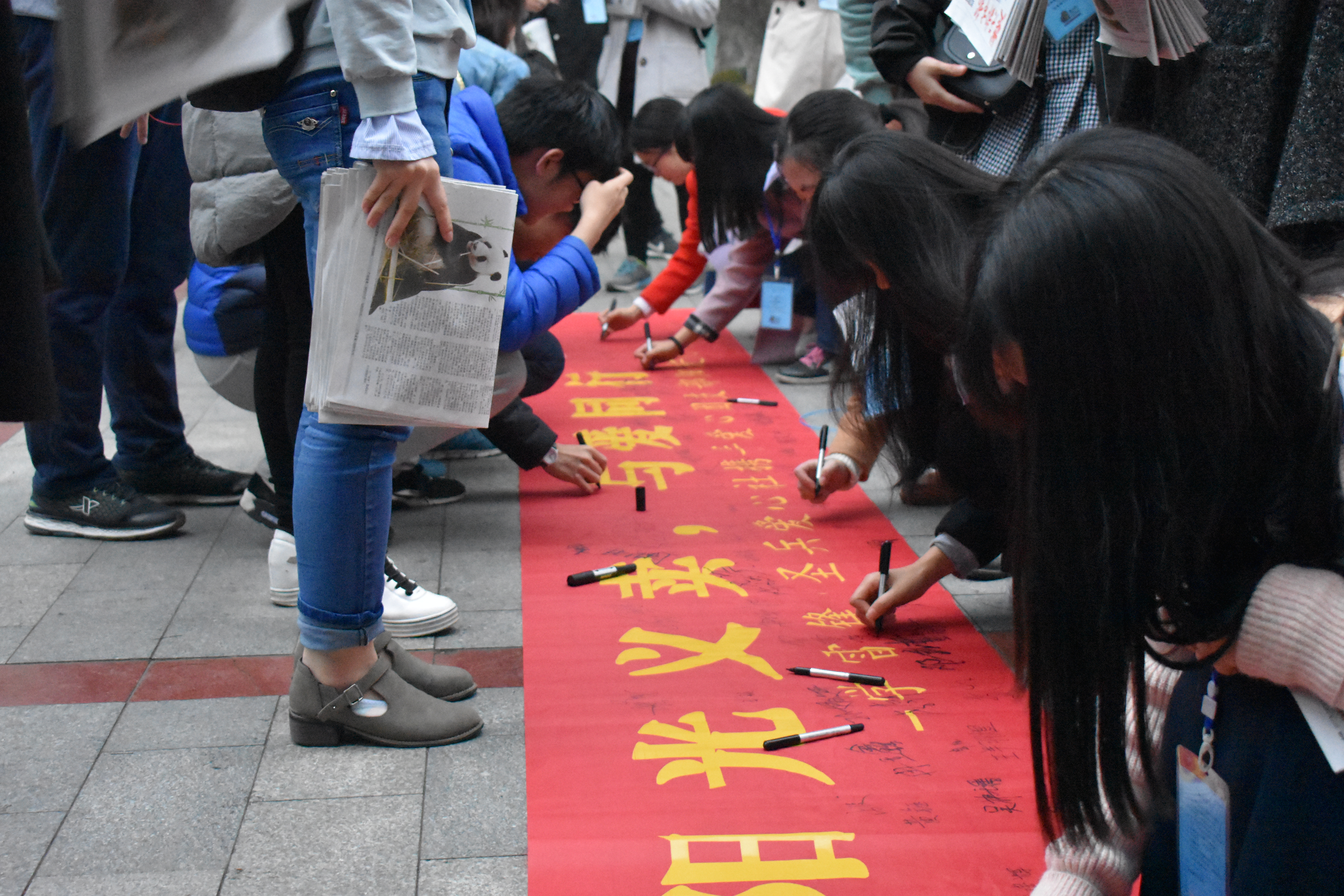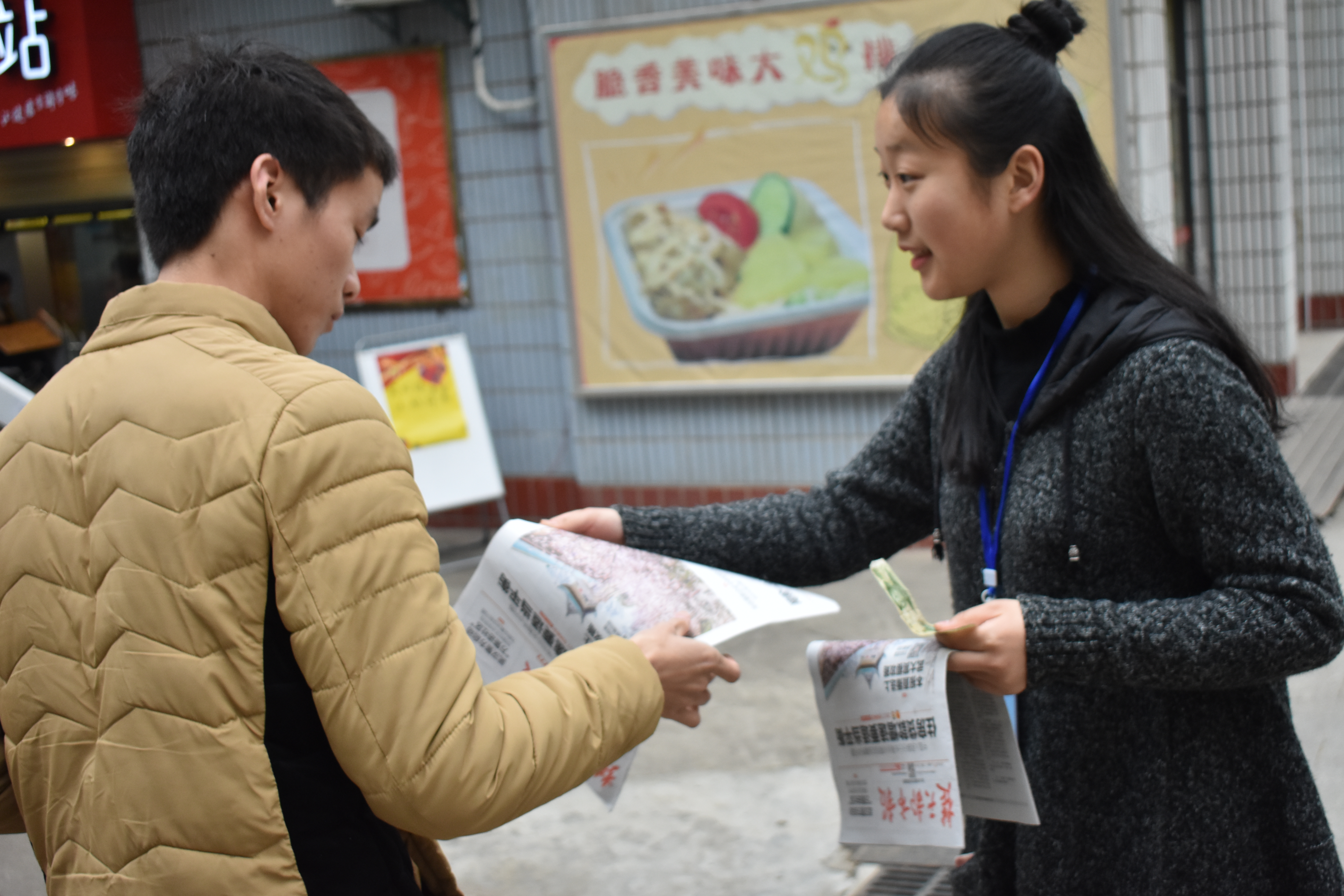 清早的武理校园显得有些冷清,只有零落的几人,但同学们也不气馁,亲切地上前问询“同学,你好!我是华中师范大学同学,代表华师圣兵爱心社参与义卖,所有的善款都将用于资助贫困学子,你的一份助力会给他们带去希望!”“叔叔,您好!......””阿姨,您好......”同学和叔叔阿姨们听闻易义卖的目的,多会停下脚步,从兜里掏出一元钱,买一份报纸,献出自己的爱心。