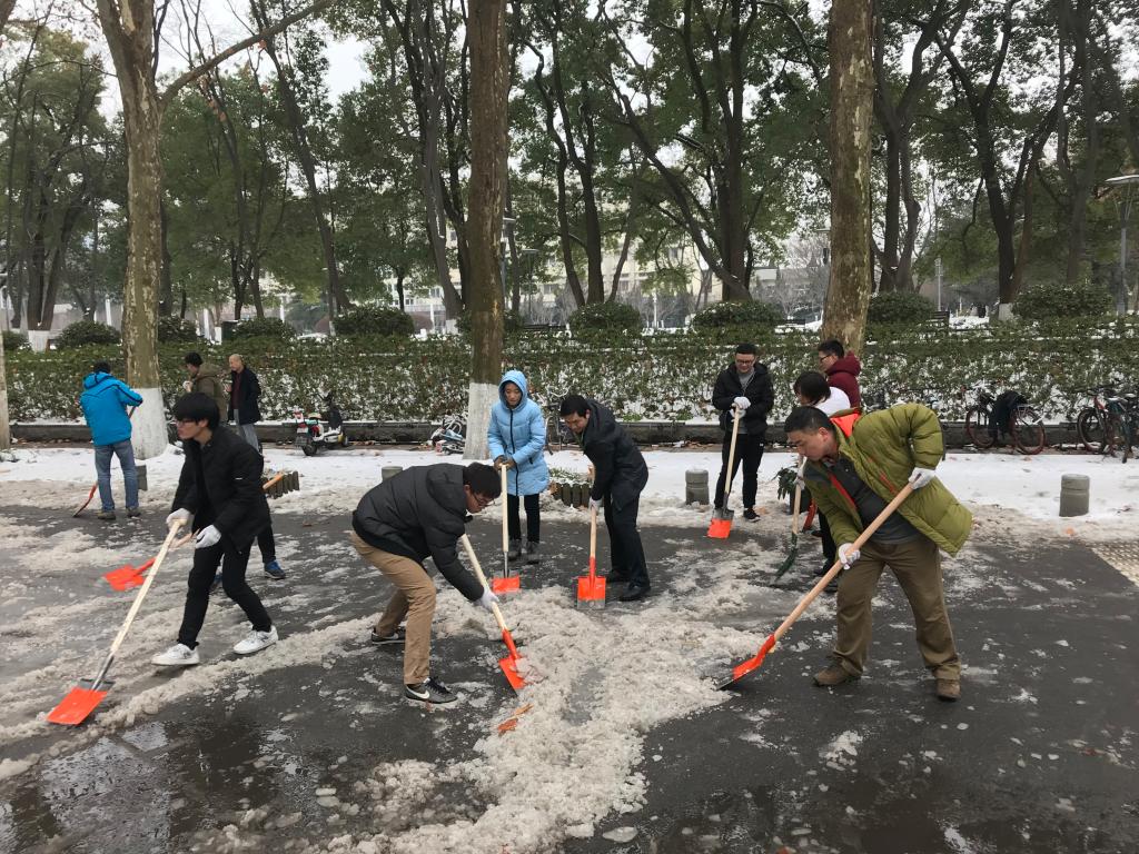 学院杨青松、段钊、刘刚、董庆兴、石义金、李超、程秀峰、蒋可鸣、穆帆共九位老师带领陈紫宇、代沁泉、陈思伟、陈秋阳、米慧馨、李娟、张孜铭、刘磊、邢书红、袁成成、陈果、赵弟发、张浩轩和唐琛共十四位学生参与了本次除雪活动。