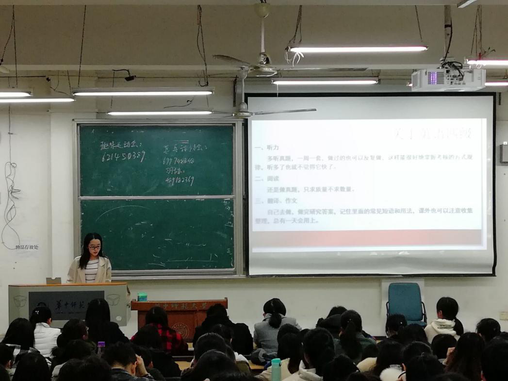 电商1702班郑珊珊与大家分享了自己学习英语的方法。在备考英语四六级的过程中,不可避免的要刷一些四六级真题,但郑珊珊强调,一定要追求质量而不是数量,每做完一套真题,要对比答案认真分析自己错误的原因。此外,郑珊珊还与大家分享了自己记笔记的方法——康奈尔笔记法,帮助提高同学们记笔记的有效性。