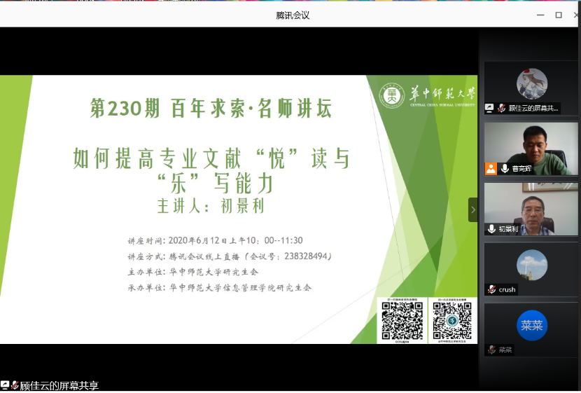 (通讯员 张文林)2020年6月12日上午10:00,由华中师范大学研究生会主办,信息管理学院研究生会承办的的第230期“百年求索•名师讲坛”在线上举行,应我院邀请,中国科学院文献情报中心期刊出版运营总监、中国科学院大学图书情报与档案管理系主任初景利教授,围绕如何提高专业文献“悦”读与“乐”写能力开展了一场讲座报告。
