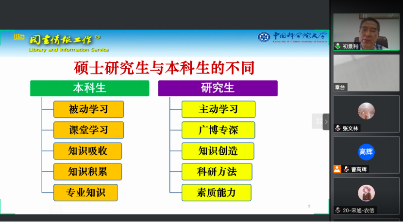 在曹院长对初教授进行简单介绍后,初教授列出本次讲座将围绕的主要内容:1.从本科生到研究生的角色转变;2.科学研究与论文写作的基本认知;3.科学研究与学术论文写作要求。首先,围绕对从本科生到研究生的转变,初教授提出要学会从被动学习转化为主动学习,并且强调研究生对知识的创新及早地进行心理与思维的转换,学会质疑不要盲从才能发现更多的知识。其次建议同学们趁早与导师建立全方位联系、多参与专业实践与学术交流、善于重新塑造自己,并树立图请专业与职业信心。
