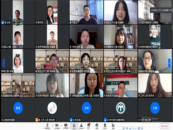 (通讯员 李雪漫)6月17日下午,信息管理学院2019年度学生先进集体、先进个人表彰大会在腾讯会议平台如期举行。本次大会综合表彰2019年度“信管之星”领军奖的优秀团队及个人,2019年度共青团工作先进集体及先进个人,2019年度国家奖学金及校长奖获奖者。大会邀请到了07届优秀校友、深圳乐其网络科技有限公司董事长周阳先生作为嘉宾。出席大会的有信息管理学院院长李玉海,副院长卢新元,副院长曹高辉,院工会主席胡潜,教师代表和全体辅导员。大会由党委副书记王涛主持。
