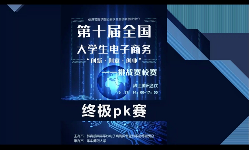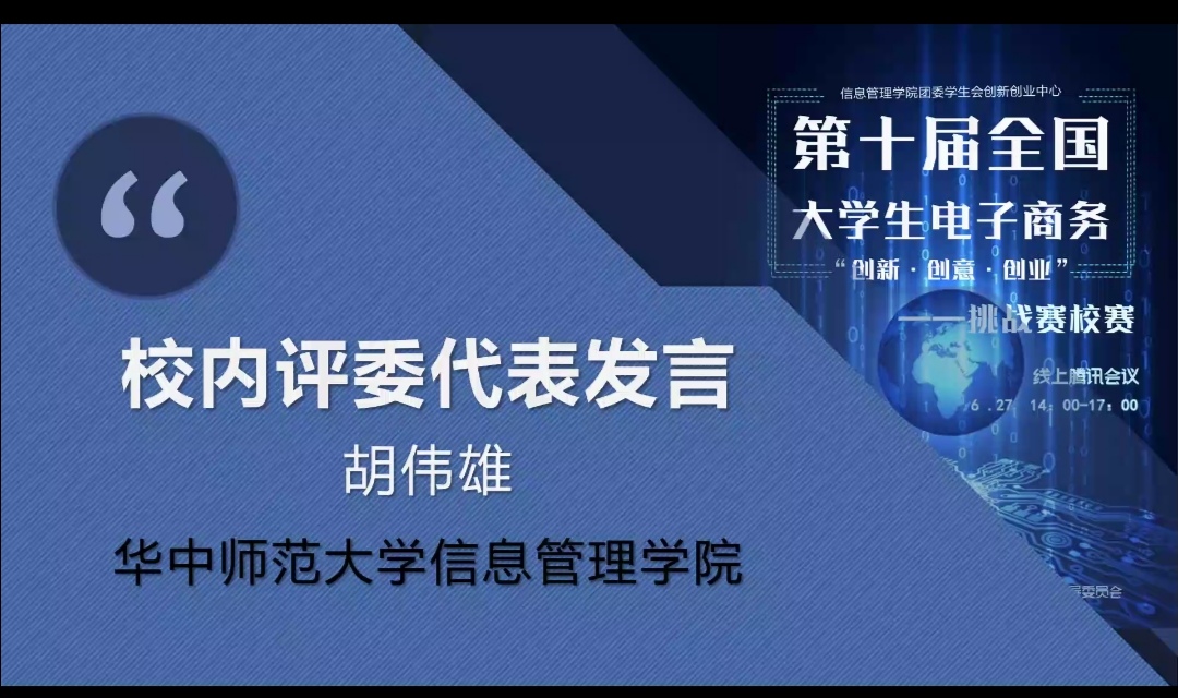 (通讯员 石丹)6月27日下午,第十届全国大学生电子商务“创新·创意·创业”挑战赛湖北赛区华中师范大学校级选拔赛在腾讯会议举行。出席本次比赛的评委有华中师范大学老师段钊、谭春辉、胡伟雄、肖毅、程秀峰、陈慧、王光超、王萍、曾江峰,莅临现场的企业评委有深圳市玺承文化传播有限公司华中大区总经理曾军容、十堰土拨鼠科技网络有限公司经理吴晓辉、武汉云客电子商务股份有限公司总经理黄鹏、神州数码总经理金佳、北省电子商务行业协会会长闫顺山和楚天同创科技企业孵化管理(武汉)有限公司董事长、湖北省楚商联合会副会长、跨境电商分会长柳艳芬。