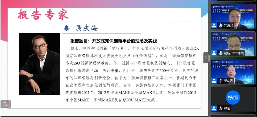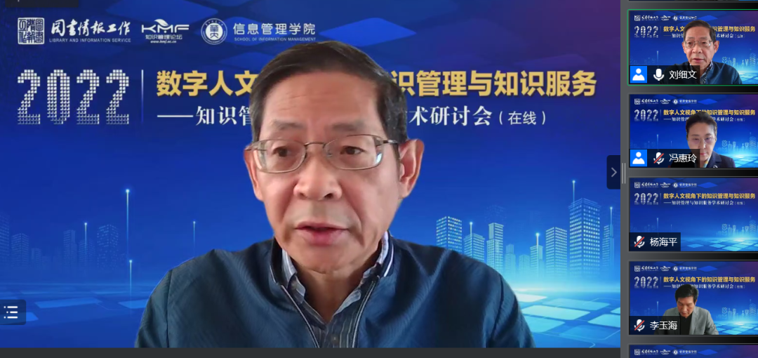 为探究大数据、云计算、人工智能等技术对知识管理与知识服务的影响,积极推动新文科建设、数字人文领域背景下知识管理与服务的快速发展,由《图书情报工作》杂志社、《知识管理论坛》编辑部与华中师范大学信息管理学院联合主办,行者互联科技(北京)有限公司、国家新闻出版署智慧出版与知识服务重点实验室、广州奥凯信息咨询有限公司协办的“2022知识管理与知识服务学术研讨会”于2022年5月13日在线召开。从事数字人文及知识管理与知识服务相关研究和实践的专家学者,共同分享了数字人文及知识管理与服务的实践进展与最新学术成果。在线人数达1 500余人。