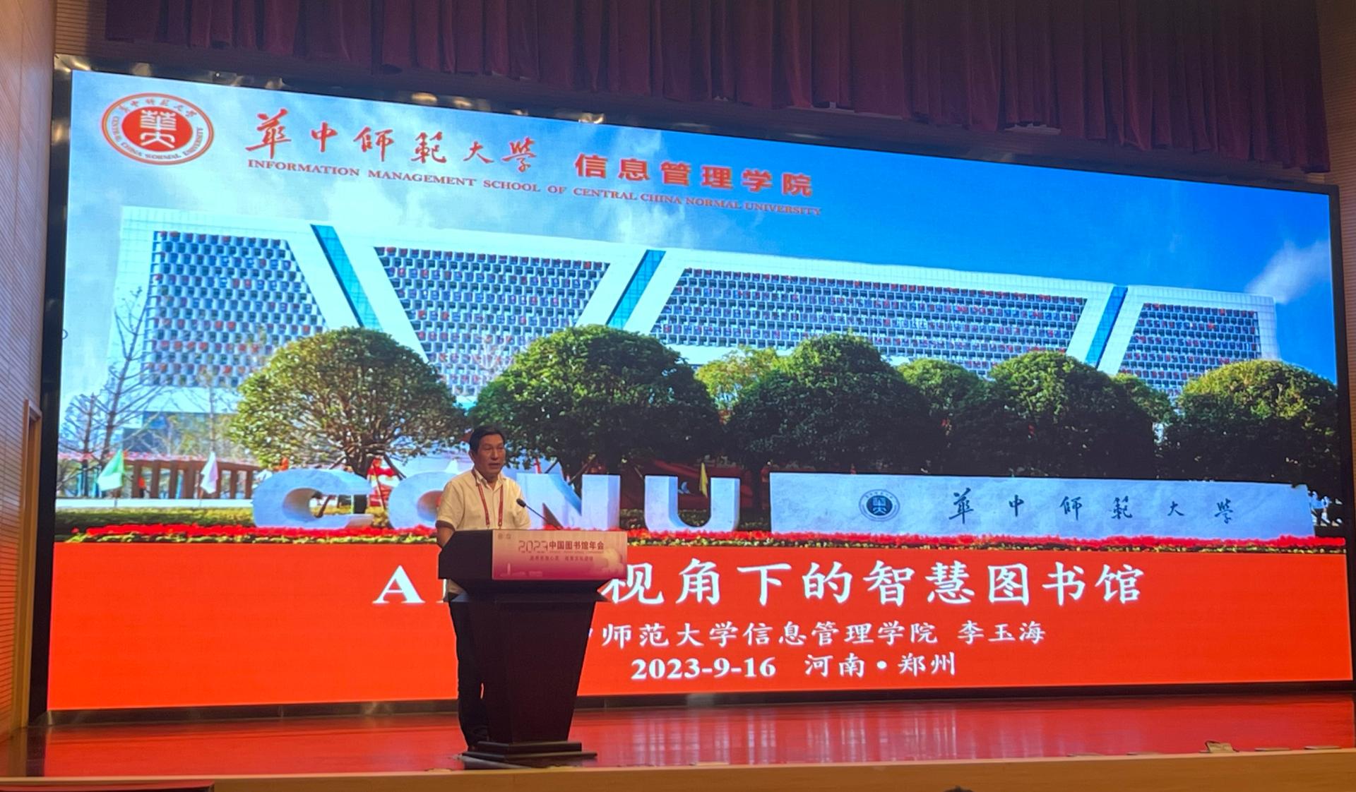 我院李玉海海院长出席本次大会,并在主题论坛6:数字学术服务与未来图书馆上作学术报告。李玉海以“AIGC视角下的智慧图书馆”为题,从现有图书馆业务演绎了AIGC功能,从AIGC视角探索未来智慧图书馆的理念、结构和功用,以及AIGC环境下图书馆员的角色及行为。