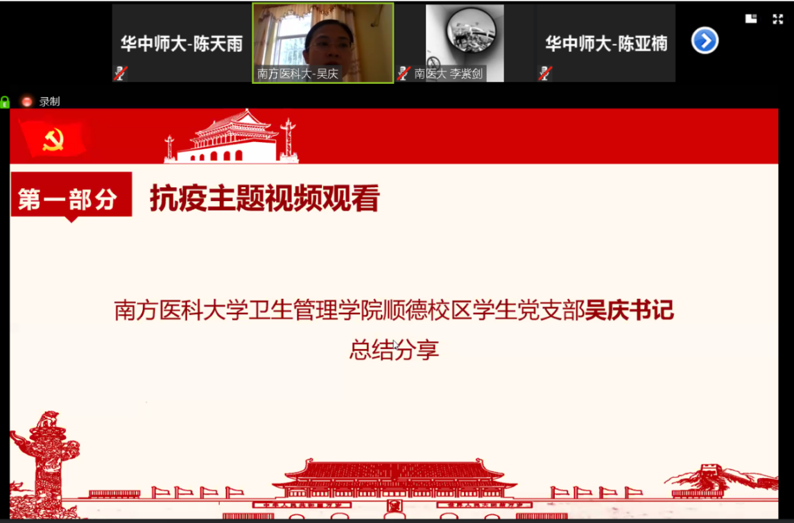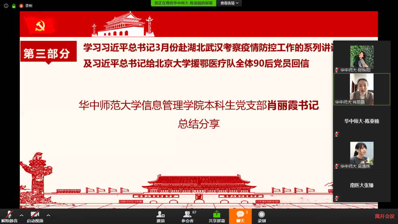 (通讯员:陈天雨,陈秋阳)3月25日上午九点,中共华中师范大学信息管理学院本科生党支部三月联合线上主题党日活动顺利开展。本次党日活动与南方医科大学卫生管理学院顺德校区学生党支部和校本部第二学生党支部联合开展。南方医科大学卫生管理学院顺德校区学生党支部书记吴庆、校本部第二党支部书记王益涛和我校信息管理学院本科生党支部书记肖丽霞共同策划并参加此次活动,活动由双方党支部党员陈亚楠同志和李紫剑同志主持。