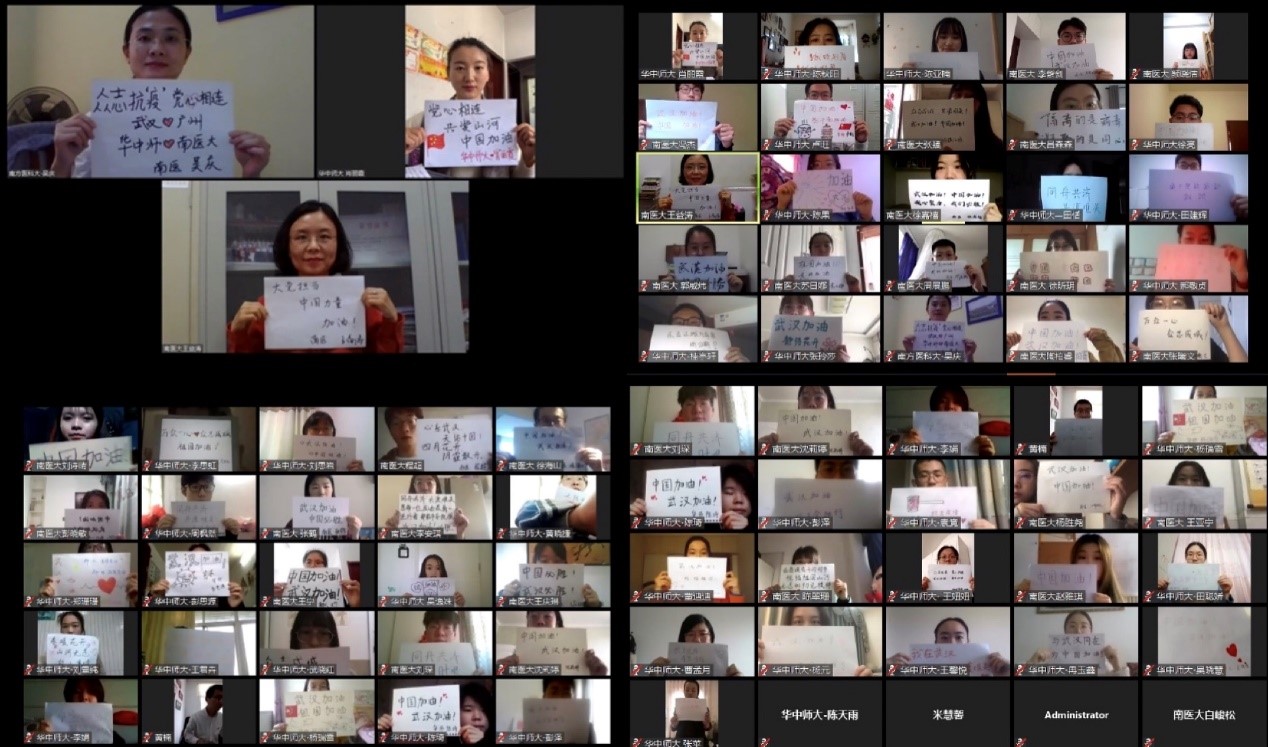 同气连枝,众志成城,活动最后,全体与会党员通过展示祝福语的方式表达了对祖国的深切祝福,本次线上联合党日活动取得圆满成功。希望党员同志们谨记“祖国如有难,汝应作前锋”的嘱托,期待疫情散去,能相约桂子山,同游珠江水畔!