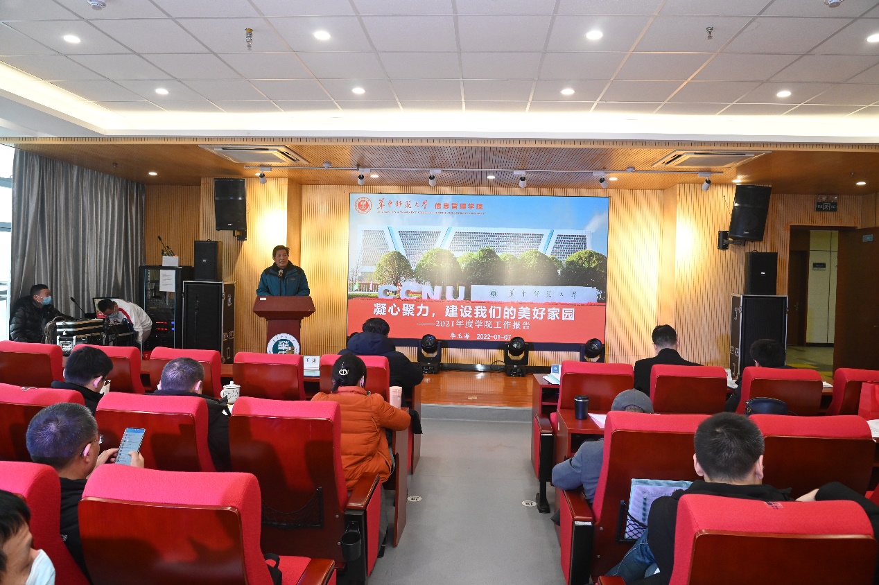 (通讯员 谢铭虎 张宁)为更好地总结过去,展望未来,凝心聚力推动学院教学科研事业发展迈向新台阶,绘就新蓝图。2022年1月7日下午14:10,信息管理学院2021年全体教职工大会于南湖综合楼N10001学术报告厅顺利召开。会议由信息管理学院党委副书记王涛主持,参会人员有信息管理学院党委书记王雨露、院长李玉海及学院全体教职工。