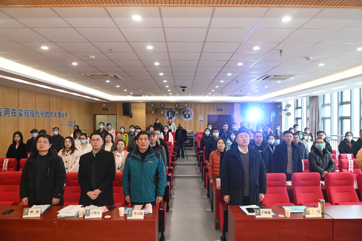 会议伊始,全体人员起立,奏唱国歌。会议第一项,胡潜教授首先汇报了过去一年学院工会的主要工作。过去一年,学院工会在疫情防控、关心青年教师发展、积极组织党组织活动、建设学院文化等方面效果显著。