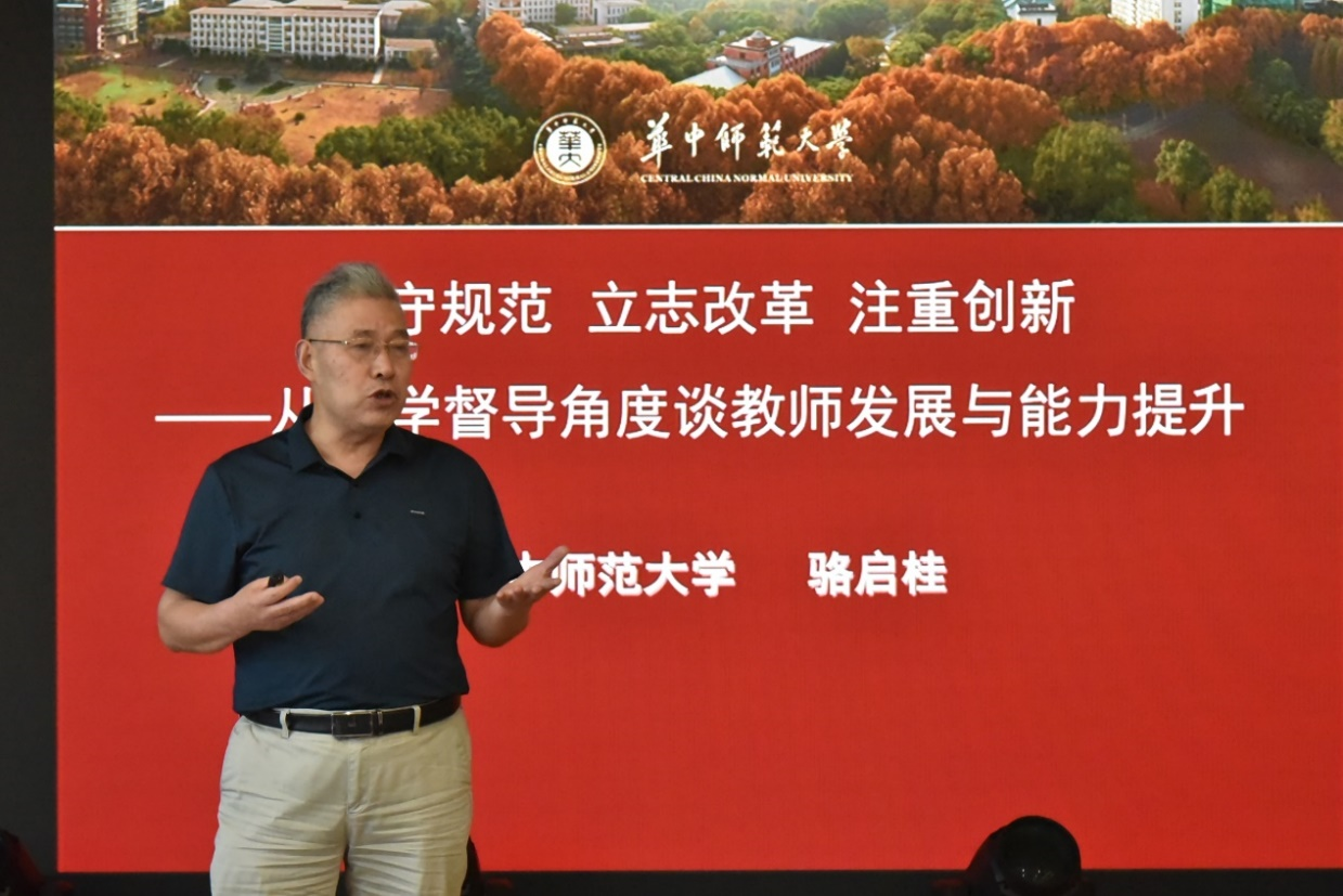 骆启桂教授在比赛结束后从教学督导的角度谈论了教师发展与能力提升。骆教授强调教师要有教学规划,要制作优秀的教学教案。骆教授还认为老师应当了解学生“如何学?”、“学什么?”、“怎样学?”,并针对这三个问题给予学生指导,这样才能教出合格的学生。骆教授认为,教学是教与学,需要学生和老师共同完成,教师们要随时更新教学理念,这样才能成为好教师,教出好学生,做出好教学。