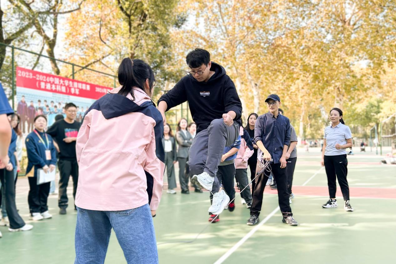 在跳绳比赛中,他们同样表现出色。信管教职工们身姿矫健,步伐轻盈,一个接着一个,有条不紊地在长绳间穿梭。参赛选手们齐心协力,配合默契,展现出高超的技巧和协调性。运动场上气氛热烈而高涨,加油助威声此起彼伏,信管教职工们齐心协力,奋勇向前,展现出信管团结友爱的精神风貌。