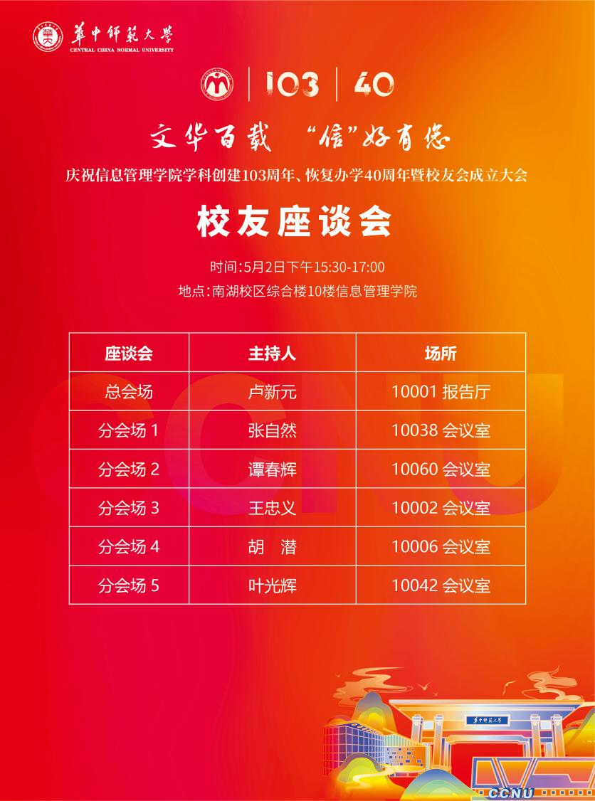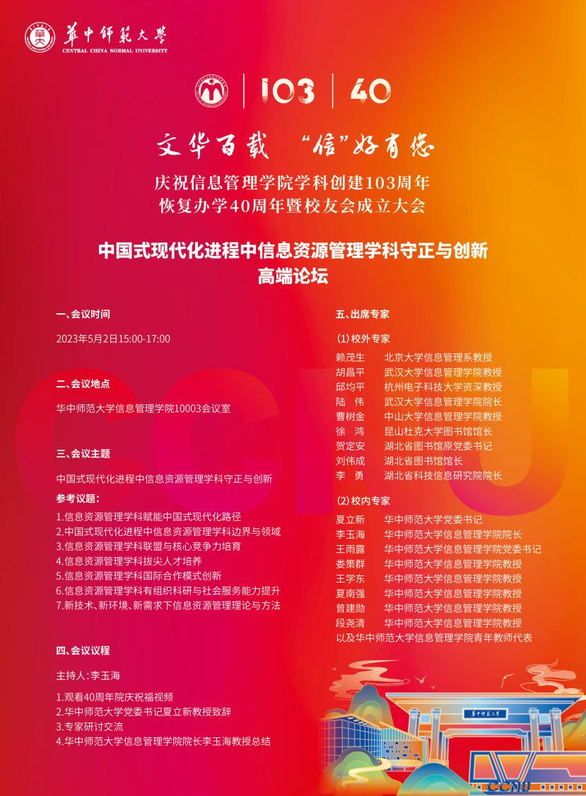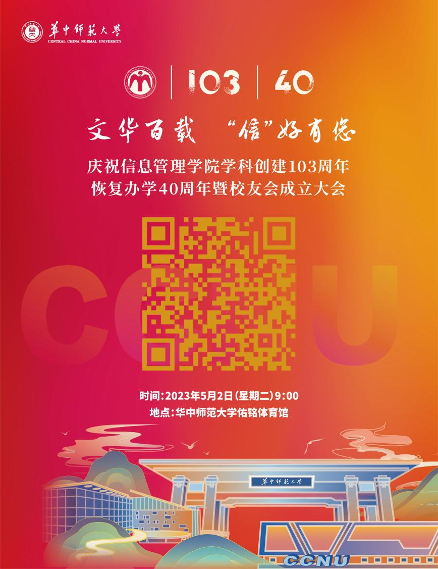 “庆祝信息管理学院学科创建103周年、恢复办学40周年暨校友会成立大会”将于 2023年5月2日(周二)在华中师范大学佑铭体育馆举办。佳期将至,诚邀各位校友和嘉宾相聚桂子山,见证历史性时刻。