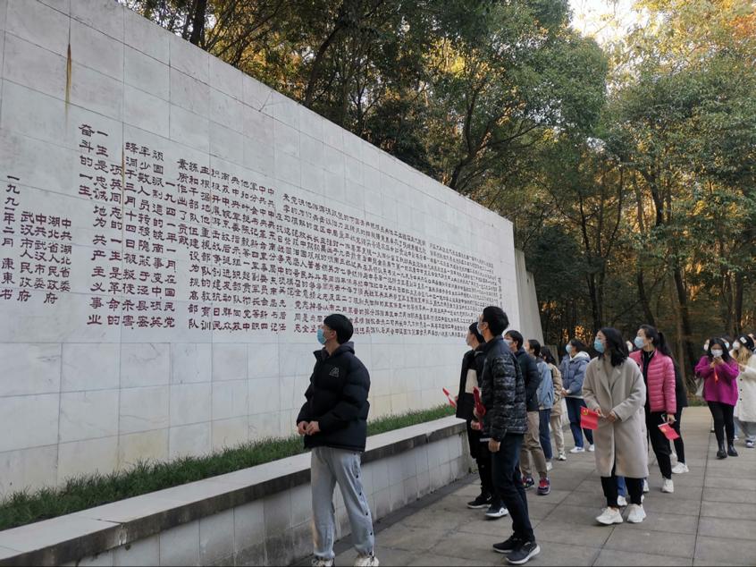 清晨,大家在华中师范大学(南湖校区)北门集合后共同乘坐大巴前往武汉市江夏区革命烈士纪念馆。江夏革命烈士纪念馆于2000年开始筹建,这栋两层仿古建筑,占地2000平方米,屹立于青龙山国家森林公园内。纪念馆三面环山,风景秀丽。东北方约200米处就是新四军首任政治委员项英烈士的塑像。