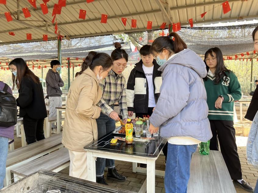 午餐选择自助烧烤,大家分工明确,相互配合,有的在烤架前热火朝天的翻动烤串,有的整理食材,有的给大家拿餐具倒饮料。同学们在烧烤过程中互帮互助,每个人都在努力贡献自己的力量,烧烤升腾起的烟火气也拉近了彼此的距离。