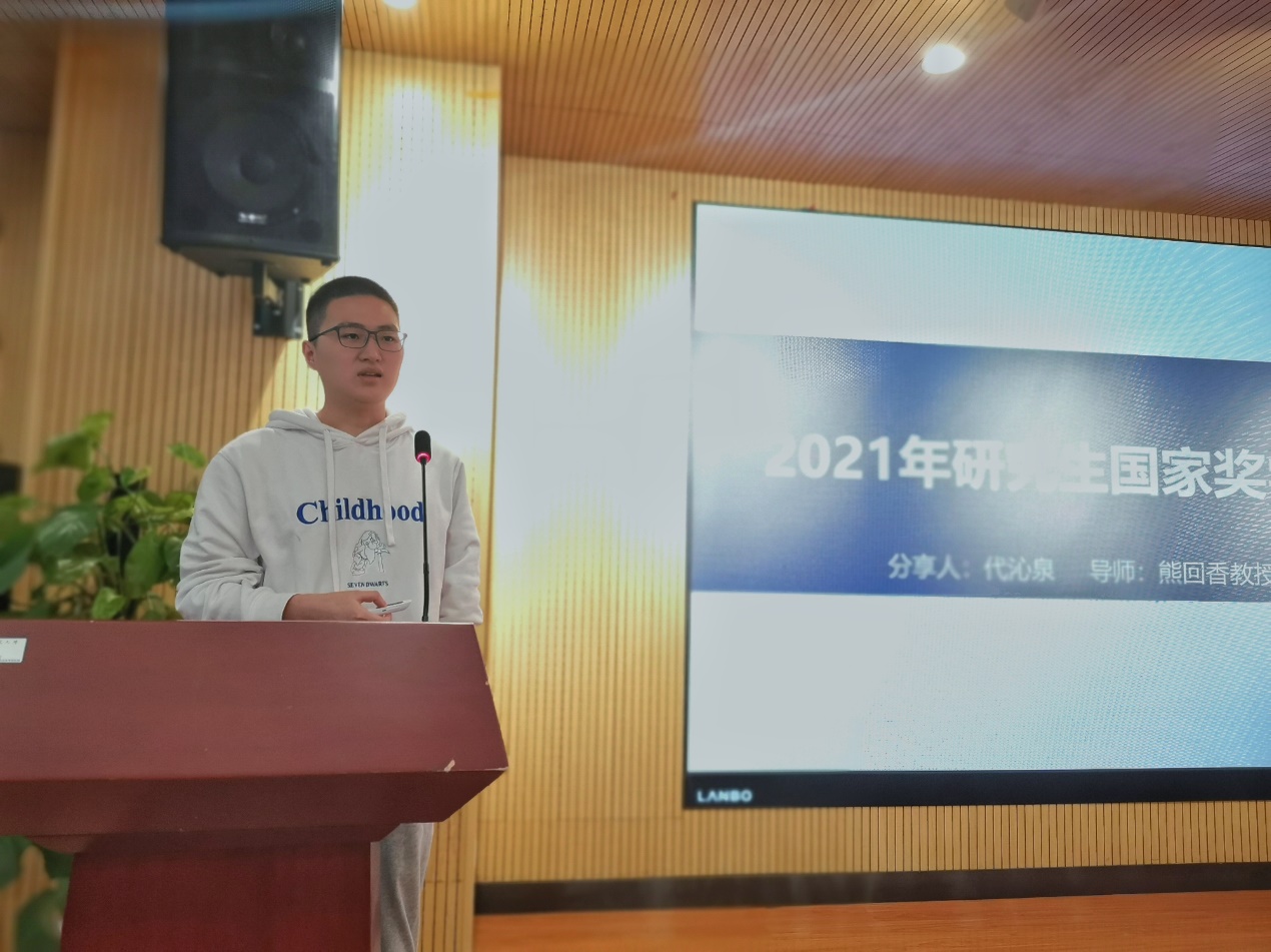 第一位进行经验分享的是信息管理学院2019级情报学专业的代沁泉同学。作为本年度信息管理学院国奖综合排名第一的优秀榜样,代沁泉同学拥有较好的学习能力与科研水平。首先,他介绍了自身的学习科研情况,向大家展示了细致的周期学业计划,建议同学们在学习的过程中保持条理性,不放松不懈怠,根据计划一丝不苟地完成每一项工作,同时以行动为上,拒绝表面内卷。接着,代沁泉同学以科研过程中的自我调节与提升的方法为例:灵感处于空白期时,更要注重沉下心去吸收知识,牢记“输入和输出是对应的”;即使论文被频频退稿也不要气馁,保持与导师的密切联系,机会总是留给有准备的人。最后,他鼓励大家在学习科研的过程中不妨大胆一些,学会抓住机遇的同时坦然接受失败,去享受拼搏过程中的璀璨。