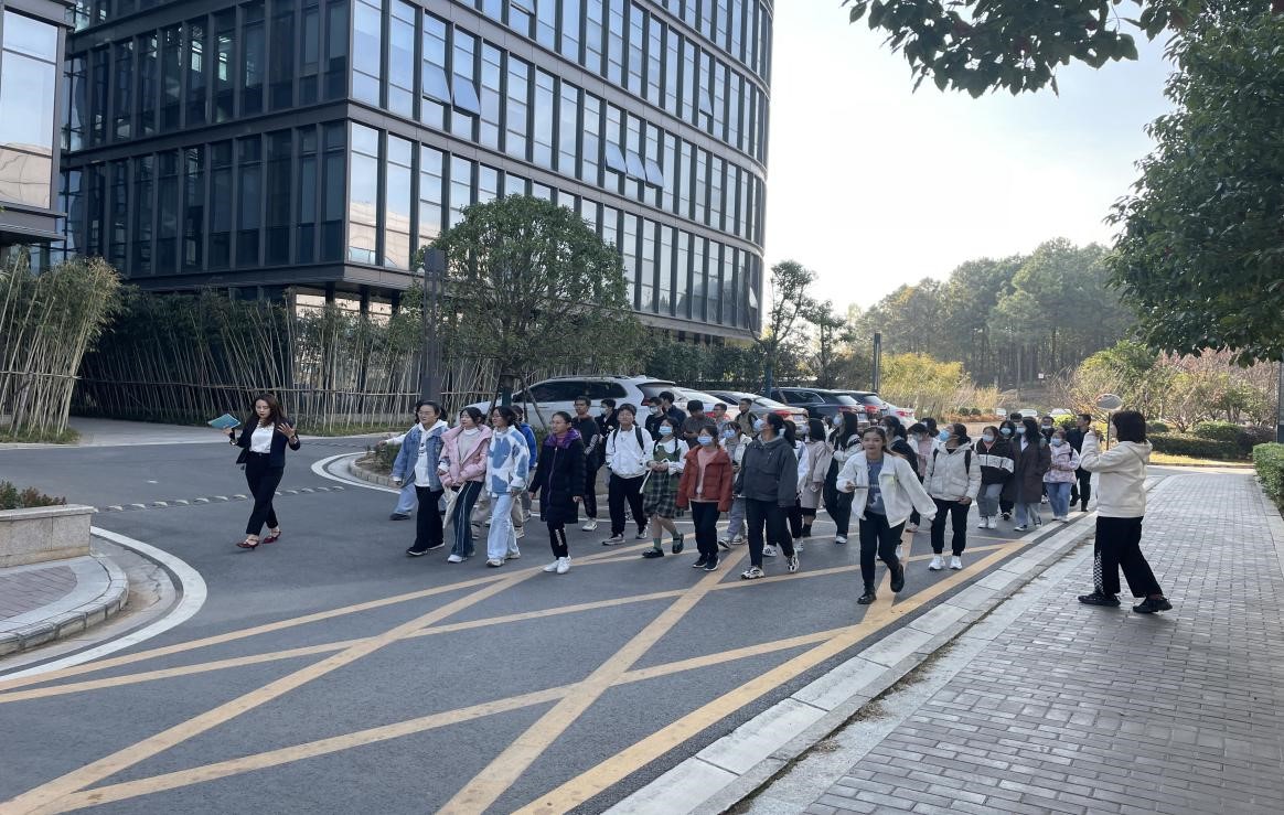 到达烽火通信后,师生们先是参观了一号楼的集团展馆,随后漫步绿道,前往公司四号楼进行游园。