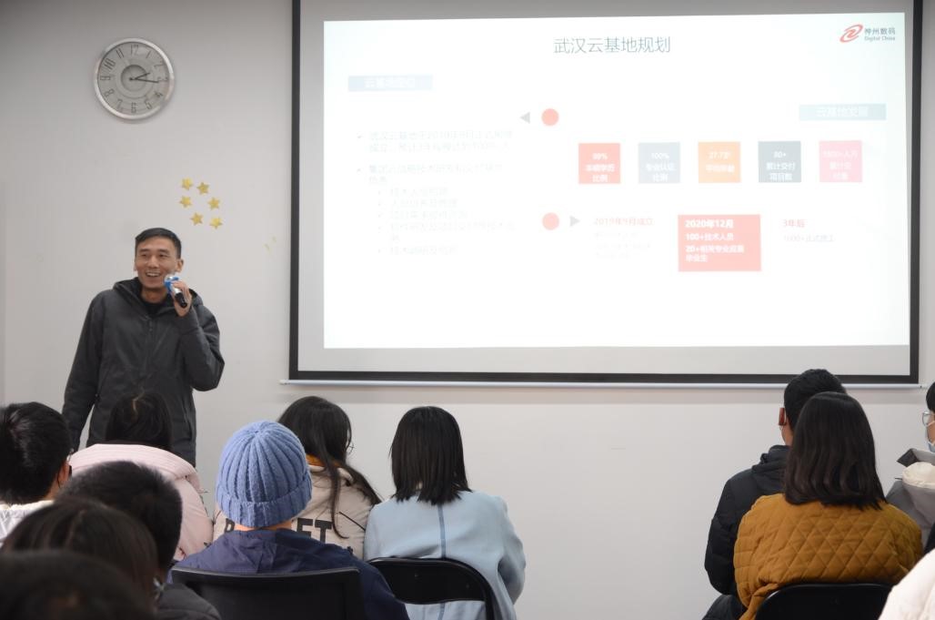 随后,技术总监胡浩文从云基地的规划、人员构架、认证资质、技术能力和标准的软件交付流程体系等多个方面向同学们讲解了神州数码云基地的特点。紧接着,胡浩文总监以2020年武汉抗疫为例,介绍了防疫大数据平台在抗击新冠疫情中发挥的的重大作用,让同学们更深刻地了解与认识云基地。