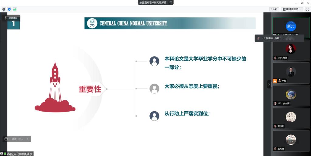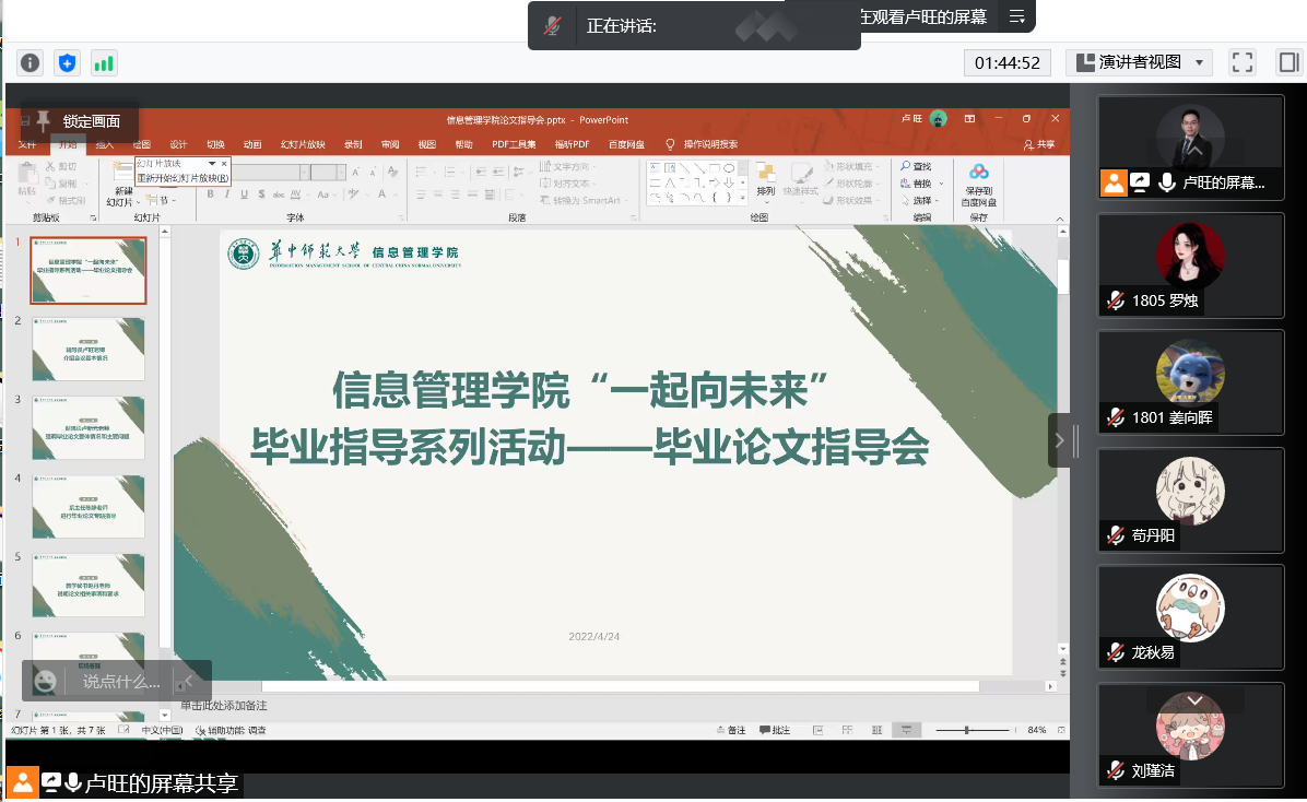 为了进一步做好我院本科毕业论文指导工作,提高学生毕业论文质量,2022年4月24日早上10:00,信息管理学院线上召开“一起向未来”毕业指导系列活动——毕业论文指导会,针对毕业论文相关问题进行指导。信息管理学院副院长卢新元、党委副书记王涛、系主任陈静、教学秘书赵丹、辅导员卢旺及2018级全体本科生参加本次线上会议,会议由辅导员卢旺主持。