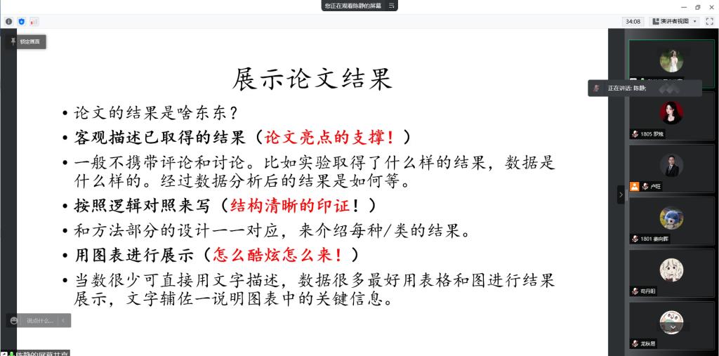 接下来陈静老师就论文查重、修改、答辩等事宜做出了具体指导。陈静老师首先提醒同学们要重视论文成果的表现形式,应该客观描述已取得的结果,重视写作逻辑与图表展示;其次指出同学们在写作时要注重丰富论文的结论,结论是论文的精髓和归宿,要具有有说服力和完备性;最后也强调要塑造完整的论文体系,只有重视论文逻辑性,才能做出优秀成果。