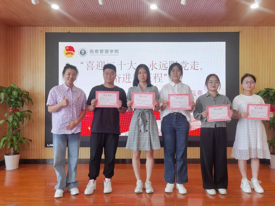(通讯员 李蓓)为鼓励广大青年将党史学习与理论实践相结合,以良好的精神风貌迎接党的二十大,9月13日中午,信息管理学院“喜迎二十大,永远跟党走,奋进新征程”百生讲坛优秀主讲人比赛于南湖综合楼10001举行。信息管理学院团委书记肖丽霞,兼职辅导员黄栊婵、吴佳琦、刘演帅、王乐和我院第十届学生团委副书记薛建伟担任评委,2021级本科生徐玉婷、娄培琳、陈文景、黎美伦、傅俊乔等同学参加本次比赛。