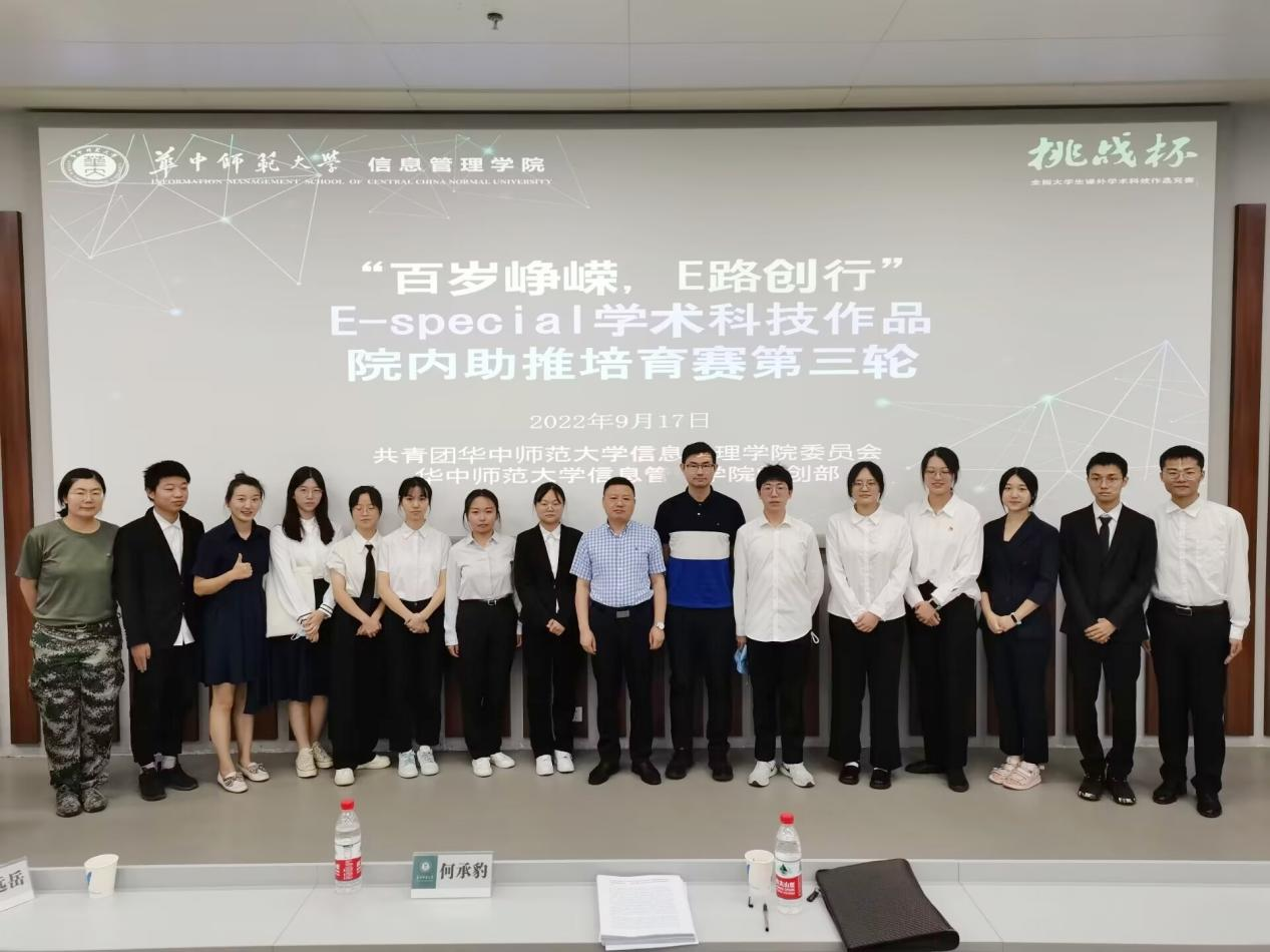(通讯员 林昌榕 韩宝瑾)为激发大学生学术兴趣,进一步提高创新能力,9月17日上午,信息管理学院“百岁峥嵘,E路创行”E-special学术科技作品院内助推第三轮培育赛于南湖综合楼N215教室举行。本次助推赛由共青团华中师范大学信息管理学院委员会主办,信息管理学院团委学生会学创部承办,共有十支学生团队参加。湖北青年创业导师何承豹,校团委副书记陶力,教育学院副教授伍远岳,信息管理学院党委书记王雨露,副院长卢新元,作为评委到场参加本次助推培育赛。