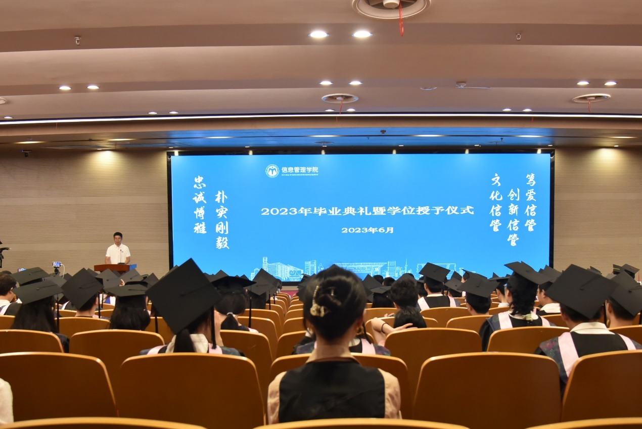 (通讯员 戴欣妍 陆璟瑶)6月11日下午,信息管理学院2023年毕业典礼暨学位授予仪式在南湖综合楼学术报告厅举行,大会由学院党委副书记王涛主持。武汉祐禾餐饮管理有限公司董事长刘春华、学院2005级校友吕世国、学院党委书记王雨露、院长李玉海、学术委员会主席娄策群、副院长曹高辉以及学院全体教师出席,2023届全体毕业生及家长代表参加,大会实施线上同步直播。
