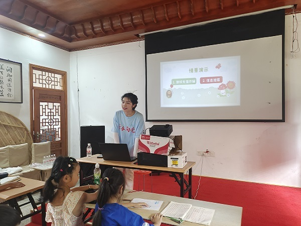 李嘉裕将本节课的主要内容分为了预防“游戏充值诈骗”与“信息泄露”两个部分。李嘉裕从孩子们感兴趣的“游戏”话题入手,询问了孩子们接触过的游戏。涉及游戏话题,小朋友们都十分积极地举手发言。在轮番发言过后,同学们的积极性也逐渐被调动了起来,李嘉裕也就此引出了此次课的主题场景之一——网络诈骗。她采用场景模拟的方式,提出网络诈骗的常用话术,让同学们对话题的发展做出选择。而对于“免费领取皮肤”这一说法,近半数的同学都选择了相信,其余同学则持有怀疑的态度。
