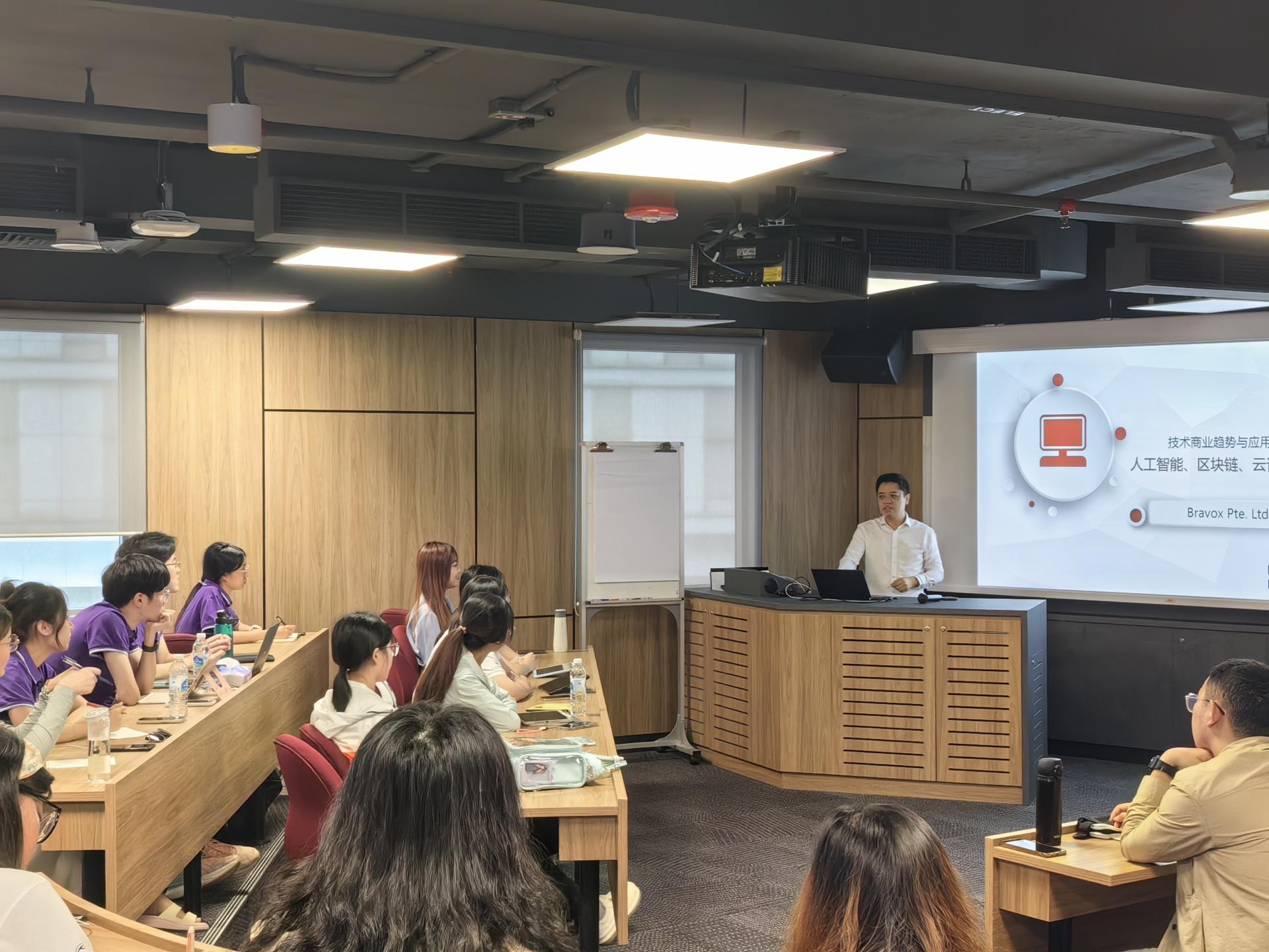 18日下午,全体成员来到南洋理工大学,参加了由BRAVOX公司专职副总裁、总经理、销售及行销总监杨涛带来的主题为“技术商业趋势与应用”的讲座课程。他就自身在华为和法国泰雷兹公司的工作经历以及全球趋势,对人工智能、区块链、云计算、大数据以及新加坡创新创业的内容进行了阐述。通过课程,同学们了解到人工智能的核心领域,区块链的特征,云计算的逻辑和新加坡创新创业的四大维度。课程末尾,就读于新加坡国立大学创业项目的学姐向同学们介绍了新加坡深造的条件和创业项目的具体情况,同学们根据自己的专业所学、兴趣发展就一些前沿问题同杨教授展开深入探讨,在交流中获得了更深的体会。