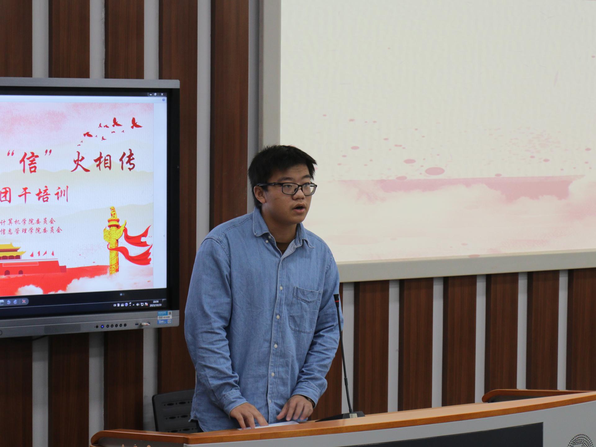 学生代表、计算机学院2023级本科生刘彦希在发言中阐述了本次团干培训的重要性、必要性,并点明了身为团干所肩负的重要责任。他表示:“青年一代要肩负起历史使命,不断学习,提高综合素质,培养创新精神和实践能力,为国家的现代化建设提供智力支持和人才保障。这才是我们当代青年的终身目标。”