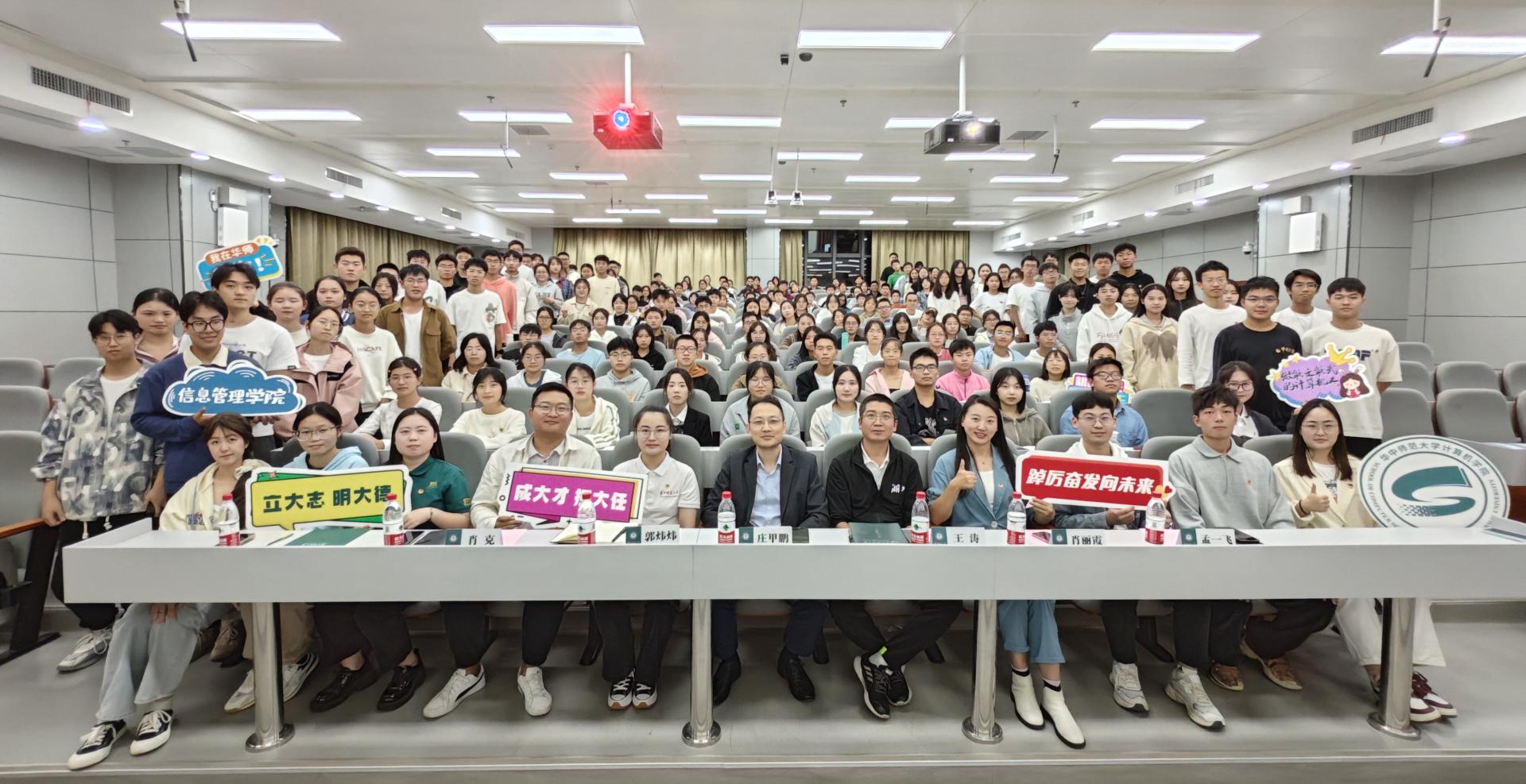 计算机学院党委副书记庄甲鹏、信息管理学院党委副书记王涛、校团委学生副书记、青年研究中心指导老师郭炜炜、信息管理学院团委书记肖丽霞、计算机学院团委书记肖克、信息管理学院本科生兼职辅导员孟一飞、两院学生团委副书记、组织部负责人,以及两院团委学生会全体学生骨干参加本次开班典礼。典礼由信息管理学院团委组织部负责人熊司年主持。