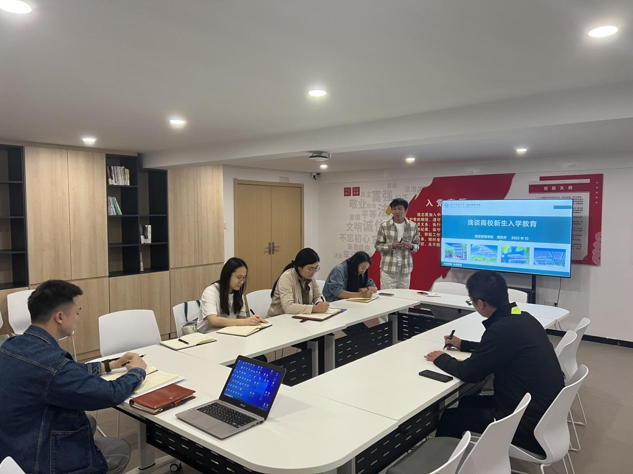 会议伊始,兼职辅导员胡凯华以“浅谈高校新生入学教育”为题进行汇报交流,结合其他高校入学教育经验,梳理2022级本科新生入学教育全过程,并同其他老师就相关工作进行了讨论。
