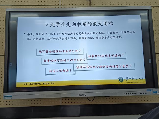 (通讯员 单禹嘉 李溶萍) 为了更好地帮助2023级新生做好大学阶段的生涯规划,了解学科发展脉络,10月30日下午,信息管理学院面向信息资源管理专业2023级学生的《新生研讨课》于南湖综合楼N313教室开展。本次新生研讨课由我院丁恒副教授主讲,主题为“如何做好大学职业规划”。
