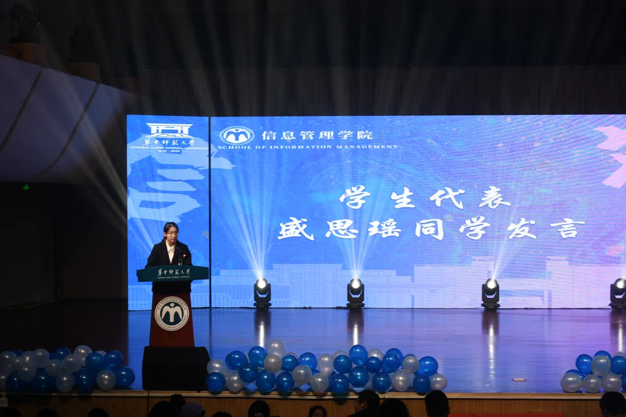 学生代表盛思瑶,在发言中分享了她的大学生活时光,很荣幸见证了学院的无数成就,也与学院一起不断进步,表达了爱在华师、爱在信管的美好。