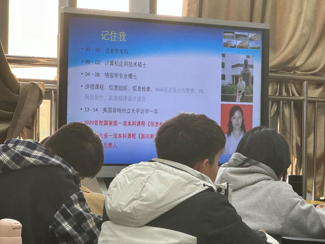 张自然向同学们作简要的自我介绍,对信息管理学院四个专业之间的关系与差异进行说明,让同学们更加了解信息资源管理专业。她向同学们解读信息资源管理专业人才培养方案中的课程体系部分,让同学们认识到信息组织与信息检索的重要性。