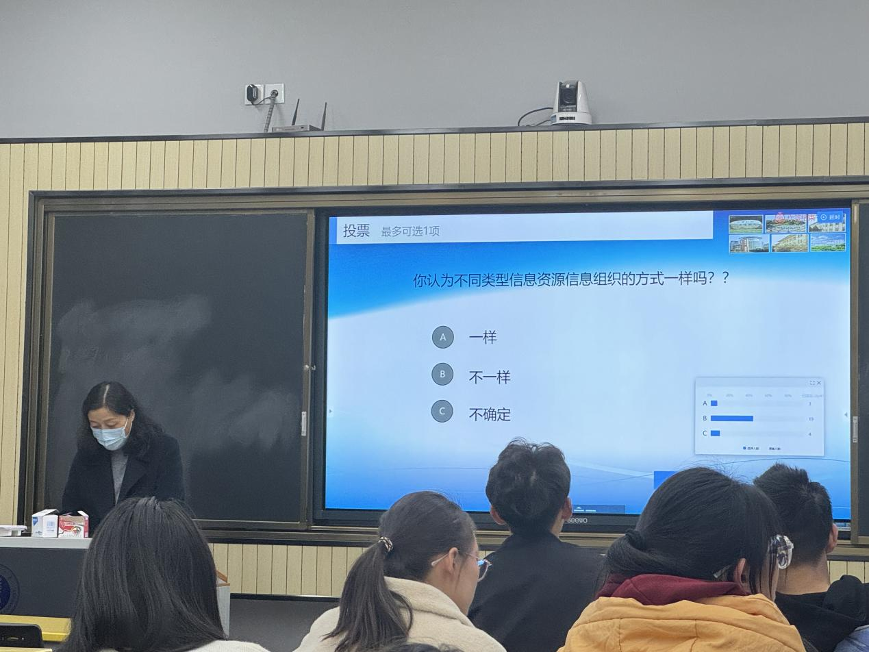 张自然向同学们介绍实物资源、文献资源、数字化资源、原生数字资源和创新型数字资源等多种资源类型,通过投票互动的形式指出信息组织更加关注文献资源、数字化资源和原生数字资源。张自然向同学们展示一些网站和APP,表明信息组织就是信息的序化与优化。
