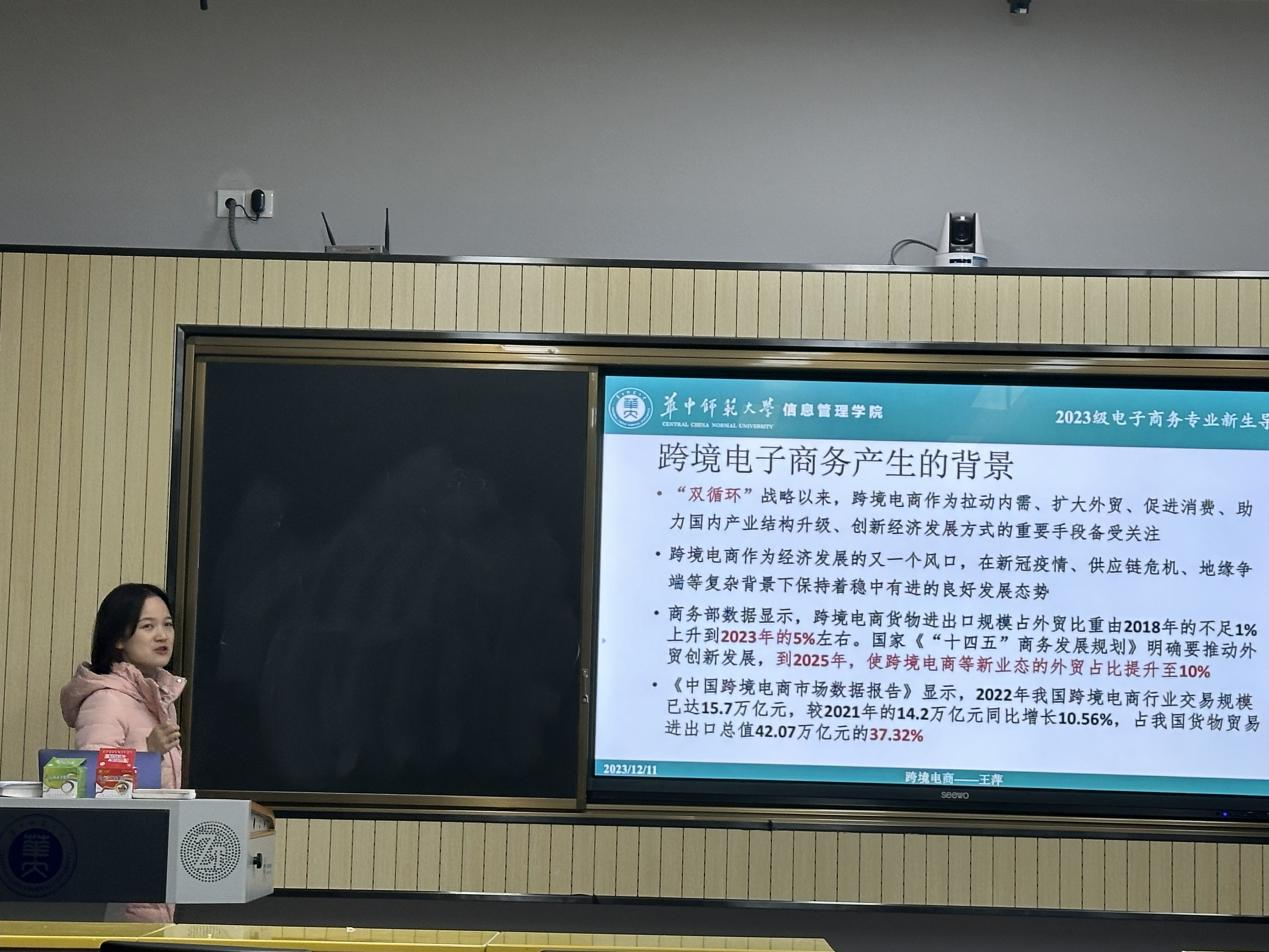 (通讯员 朱文博 赵星雨)为了更好地帮助2023级学生了解电子商务专业的相关知识,12月11日下午,信息管理学院面向电子商务专业2023级学生的《新生研讨课》于南湖综合楼N312教室开讲。本次新生研讨课由我院电子商务系王萍副教授主讲,主题为“走进跨境电子商务”。