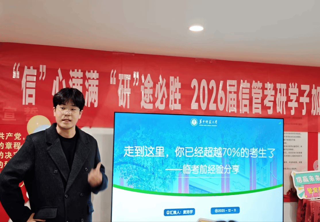 (通讯员 路雅丽)冬日的晨光漫过自习窗,笔尖划过习题册沙沙作响,2022级信息管理学院考研学子的冲刺战歌已进入最后篇章。为驱散考前焦虑、传递学院关怀,12月11日晚,信息管理学院在南湖2栋社区举办考研加油会,为即将奔赴考场的学子加油鼓劲。信息管理学院党委书记王雨露、2022级辅导员蒋可鸣出席活动,2025届上岸学长学姐——信息资源管理专业硕士陈镜、管理科学与工程专业硕士窦浩宇带着“实战经验”为学弟学妹们拨开考前迷雾。