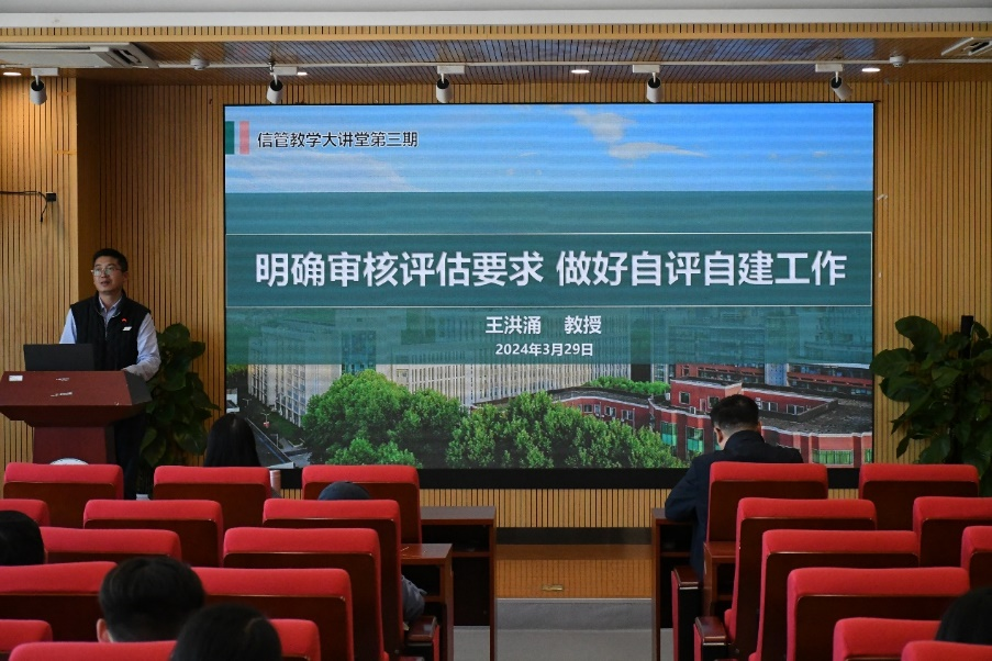 (通讯员 贺金阳 陈浩南)近日,信息管理学院教学大讲堂第三期在南湖综合楼N10001召开,本次教学大讲堂特邀文学院教授王洪涌,主讲题目为“明确审核评估要求,做好自评自测工作”,学院党委副书记王涛主持报告会,学院全体教职员工参加本次会议。