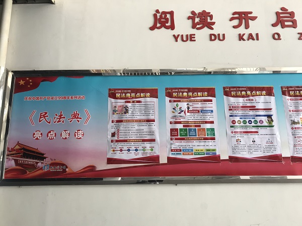 实地调研的最后,追光实践队书气香香分队队员李丹丹参观了图书馆宣传栏,主题为“祝中国共产党成立99周年系列活动——《民法典》亮点解读”,翔安区图书馆海报宣传具有很强的时效性,紧跟时政热点新闻,坚定不移跟党走,贯彻落实习近平总书记的重要讲话。在中国共产党的领导下,在即将迎来党成立的一百周年之际,翔安区图书馆将不断提升文化公共服务水平,共同推进党领导的文化事业蓬勃发展。