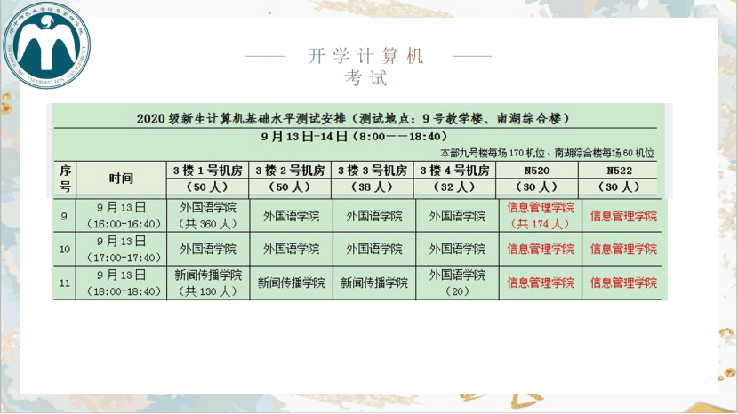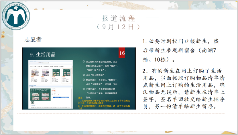 本次培训内容分为报到流程、环游路线、必要介绍以及注意事项四个部分。秦瑜把志愿者所做工作做出了细致梳理和明确要求。首先,在新生准备开学物品时,志愿者需提醒新生携带必需证件,并掌握新生入校时间,提供行李搬运、带路指引、宿舍参观等帮助服务。为了使新生报道流程及时顺利完成,志愿者要辅助新生完成认证报道。开学当天,志愿者应带领新生前往南湖信息管理学院处提交报到所需资料、领取学生证等证件,并到南湖综合楼10楼注册处加盖注册章。与此同时,对于在网上订购生活用品的新生,志愿者要将所订购物品当面清点,确认签字。志愿者还要提醒新生前往宿管处领取宿舍用品、检查军训服装是否需要更换。