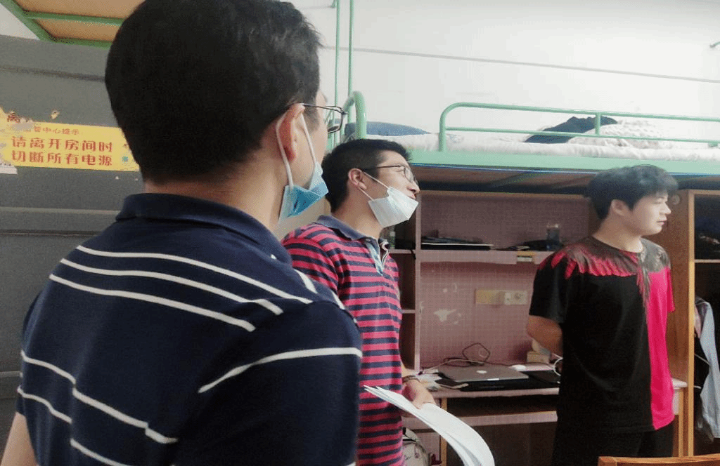 在南湖6栋男生宿舍,李玉海院长首先代表学院对新同学的到来表示欢迎,随后详细的询问了新生的户籍来源、所学专业、住校情况以及遇到了哪些实际困难等,并提醒各位同学要注意温度变化及信息安全,防止上当受骗等行为的发生。卢新元副院长热情地询问同学们的专业与导师,并与同学们就学习问题开展进一步交流,耐心的教导同学们应强化专业学习,提高专业素养。王涛副书记嘱咐新生今后在学习或者生活中遇到困难可及时联系辅导员帮助解决,提醒同学们注意秋季寒热交替。