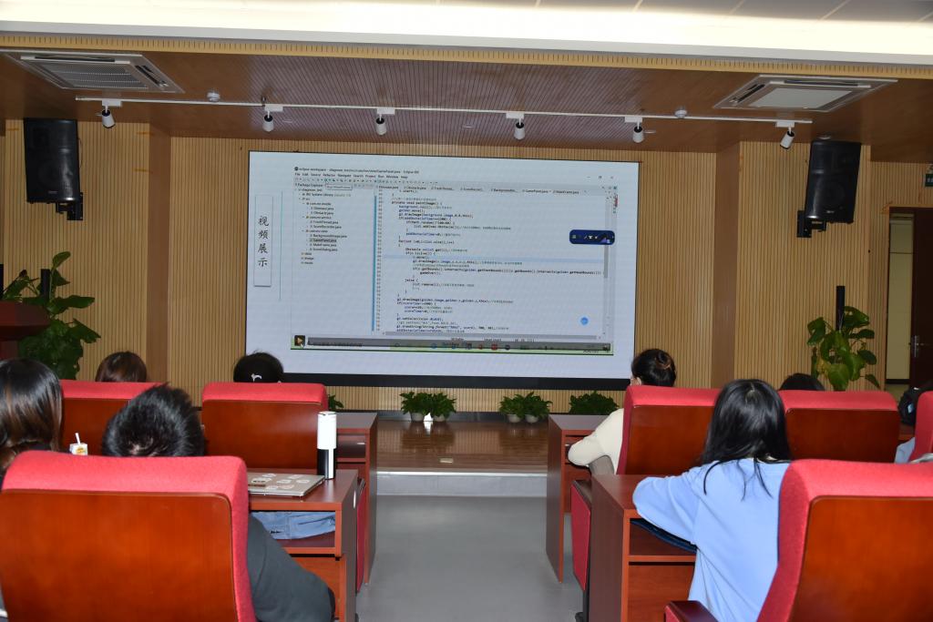 展示环节正式开始,首先是汪玉琦、庞雨静、夏玉清展示了各自的作品。她们各自展示了自己的游戏作品页面,汪玉琦分别从作品简述、作品框架、视频展示介绍其基于Java的跑酷小游戏设计。接着庞雨静演示趣味套牛小游戏,并从专业知识角度介绍了此款游戏设计的具体方面,包含小游戏的开发介绍、环境搭建与项目结构、资源导入与场景搭建、牛的设计与套牛检测。还进一步为现场同学展示具体环节的代码设计,引起现场同学的赞叹。夏玉清展示的作品以“长征”为主题,介绍产品背景及意义,希望通过提供一个在线长征基础知识学习教育平台,来展示和弘扬红军长征的历程、故事、精神、文化等。随后她向同学们具体展示产品功能。