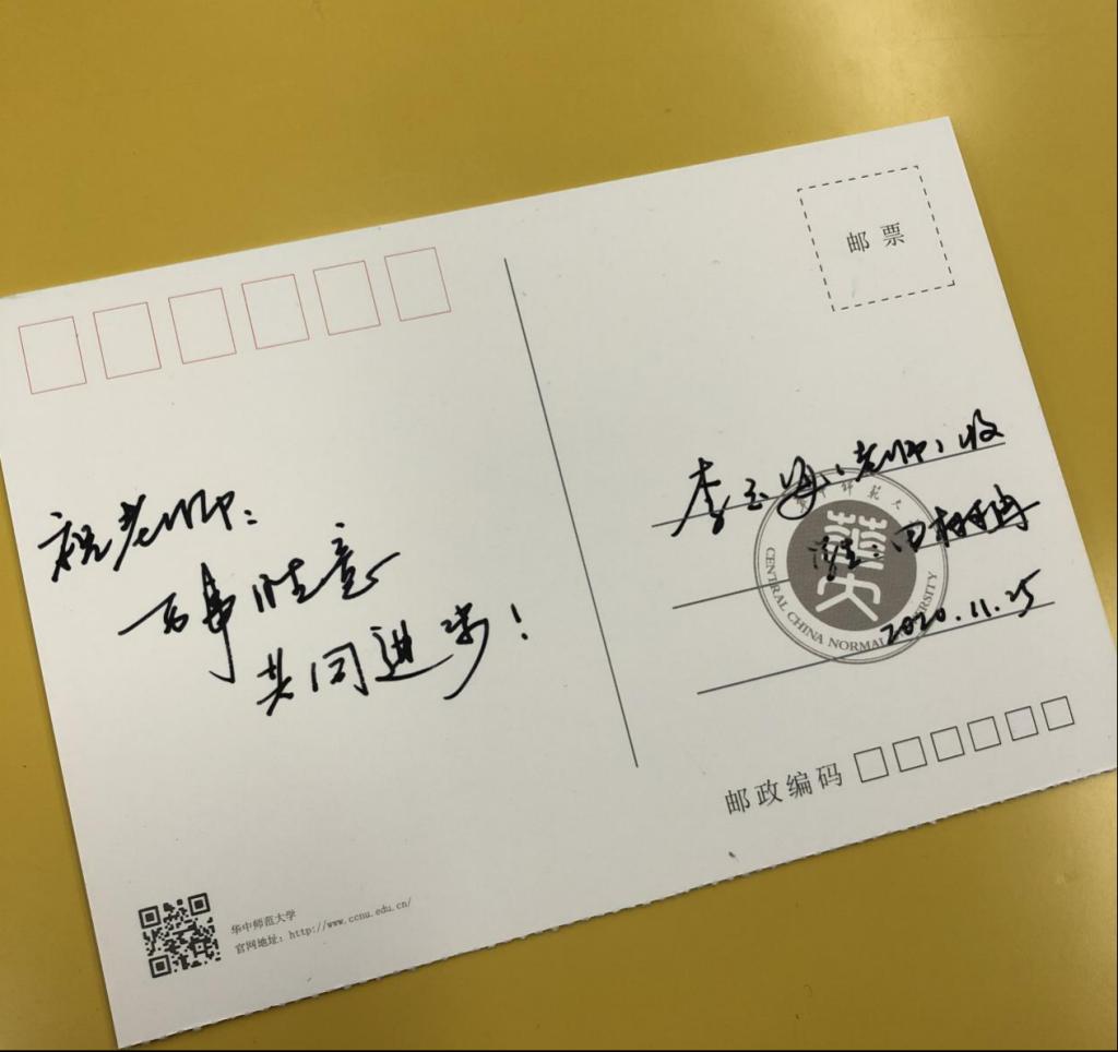 (通讯员 贺满)为响应学校研究生工作部及校研究生会的号召,在全院范围内创建良好的研究生导学关系,营造导师“教书育人”的良好氛围,增进导师与研究生之间的师生情谊,为以后的学术研究工作创造良好的工作氛围。2020年11月23日-11月28日,我院顺利开展了面向我院师生开展的“研路同行·师其意不泥其迹”明信片寄语活动。