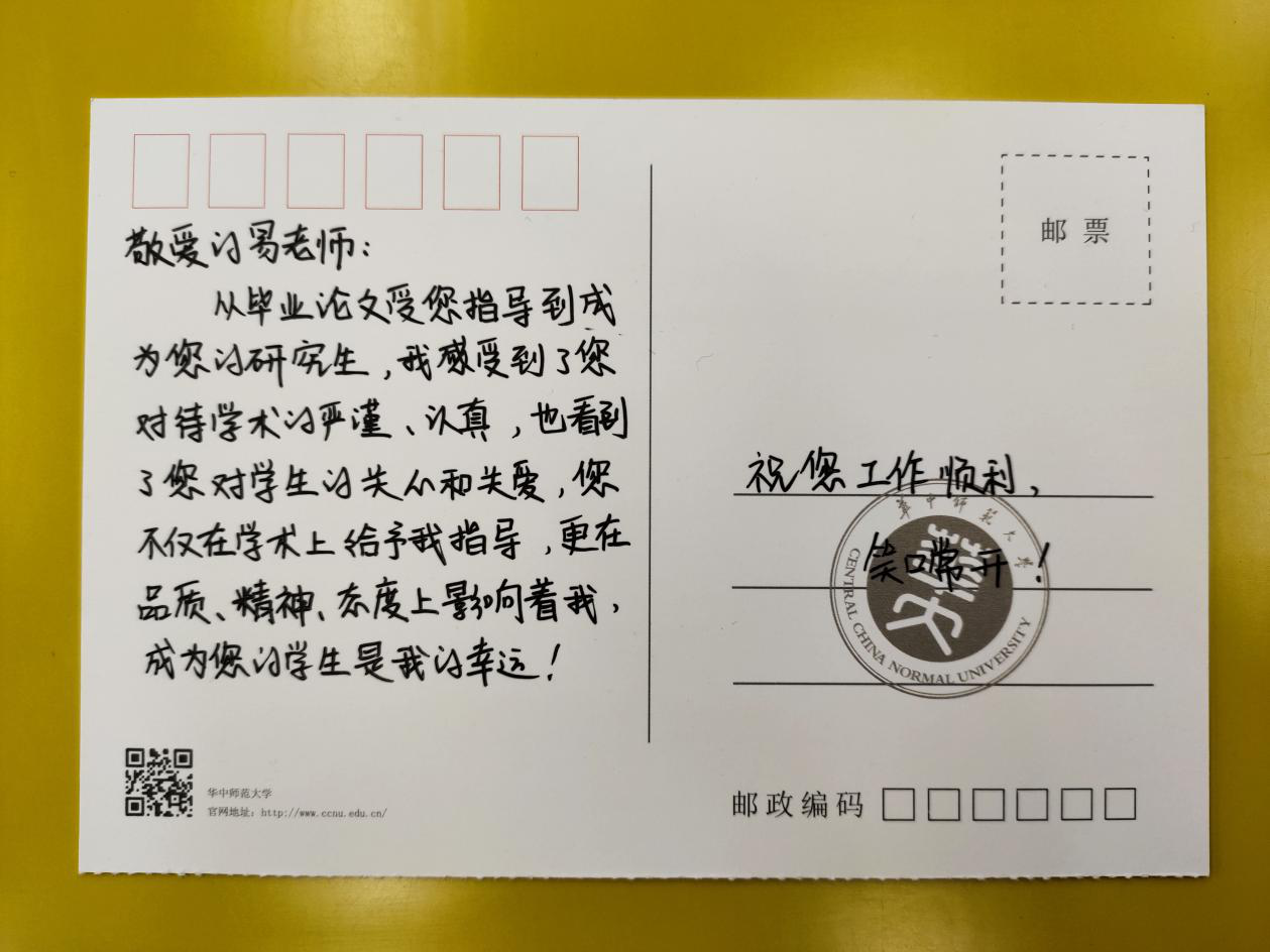 本次活动不仅搭建了导师与学生之间沟通的桥梁,还增进导师与研究生之间的师生情谊,同时也为以后的学术科研工作营造了良好的氛围。至此,本次明信片寄语活动圆满结束。