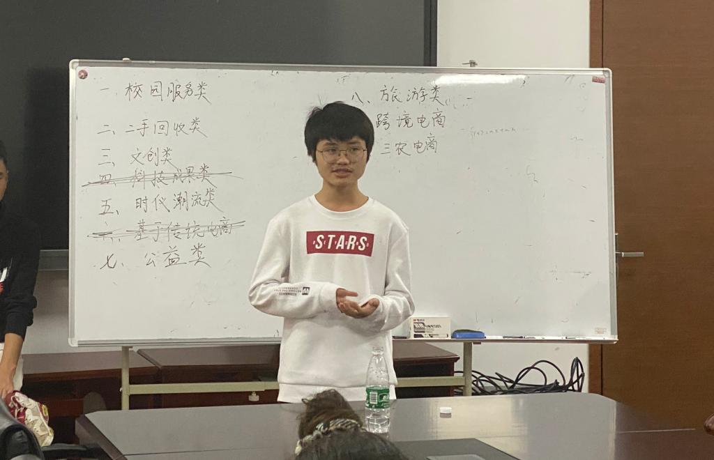 主动分享结束后,便来到了自由交流环节,王嘉宁要求每个人都要根据这十个方向上台说出自己的想法,提出新点,以对十个问题进行深层次分析及完善,其中关于校园服务类的想法最多。这些想法中,大多数都是对望凌锐及严思豪的想法进行扩充,包括如何去完善这个小程序以让这个小程序有更多样化的功能。其他成员也分享了自己的想法,有成员提出想设计一个程序去承包他人生日宴,有人则希望学校中的水卡能够绑定个人信息,防止水卡丢失只能重新购买水卡一情况的频繁发生,同时绑定个人信息也可以方便失物招领,防止他人以假乱真。