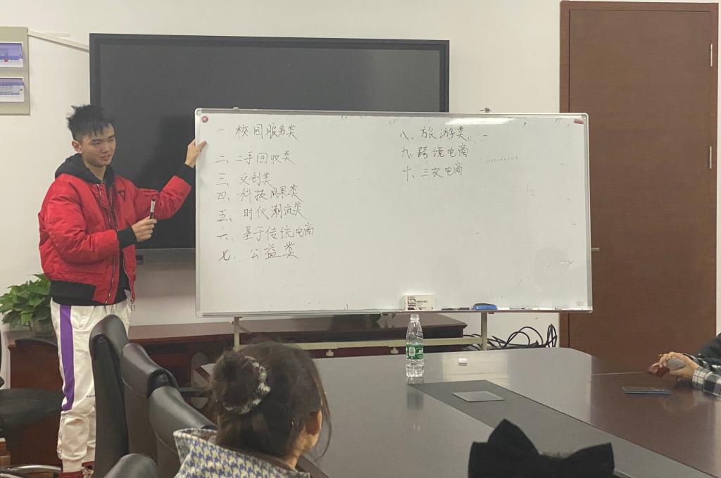 会议伊始,王嘉宁根据三创赛的大致情况向成员们提出了可以尝试去思考的十个方向,其中包含校园服务类、二手回收类等,并给予成员几分钟的思考时间。紧接着王嘉宁让各成员进行想法表述,首先进行分享的是协会成员梁正霖,他依据公益类产品痛点以及切步方向,提出了一新产品——无障碍键盘,即通过制造触觉或者听觉来尝试解决有障碍的人难以使用键盘的问题。随后是望凌锐以及严思豪分享了他们二人基于校园服务类产品产生的共同想法——做一个能够在上面发布一些如二手交易,失物招领等小任务的小程序。