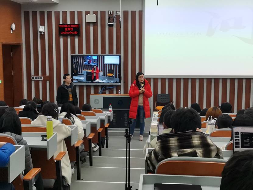 在分享结束后,彭珵与现场同学进一步进行交流,解答同学们的问题。18级本科生刘奥就如何看待实习岗位与最终就业岗位不一致的问题向嘉宾提问彭珵表示实习过程是一个不断尝试的过程,在这个过程当中同学们可以寻找自己适合的、感兴趣的职业,企业选择人才是主要是从所应聘岗位的专业能力进行判断,而非只看所学的专业,并鼓励大家在本科学习阶段积极寻找合适的实习岗位,不断积累专业能力。蒋可鸣老师还请彭珵为大家介绍秋招与春招的不同之处,彭珵为同学们做出了详细的解答。