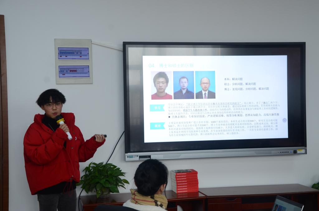 交流会主体部分是由学院本科2018届优秀校友周鼎、潘英增、袁健国、刘咏伦、童彤五位同学进行现场交流,他们分别就读博、考研、工作后考研、工作、留学五种未来规划进行分享。