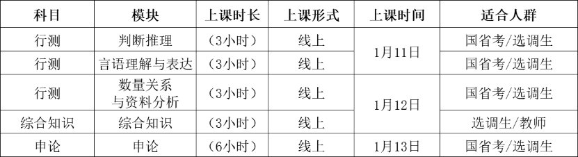 从1月11日到1月13日,课程围绕着行测,综合知识和申论三大板块展开,老师们运用生动的语言和丰富的经验,给同学们带来了非常有用的公开课程。由于疫情影响,本次课程只能在线上展开,虽然老师和同学们不能面对面交流,但借助直播课程APP和微信等工具,课程质量丝毫不打折扣,同学们都收获到满满干货。